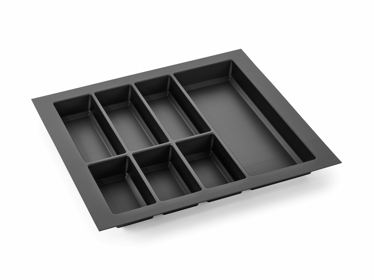 Der Besteckeinsatz Adesso 2 mit schneidbarem Rand ist ein echtes Organisationstalent in der Küchenschublade und sieht gleichzeitig schick aus. Für die ordentliche und getrennte Aufbewahrung von Besteck und Kochutensilien ist er mit mehreren Fächern in unterschiedlichen Größen ausgestattet. Da der Rand zuschneidbar ist, kann die Besteckablage auf die vorhandene Schubladengröße angepasst werden. Mit ihrem geradlinigen Design und der matten Optik in Schwarz lässt sie sich gut in moderne Kücheneinrichtungen integrieren.