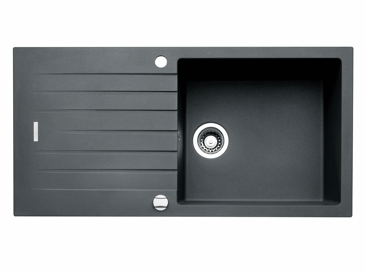 Einbauspüle. Composite, mit großem Becken und Abtropffläche, reversibel. 3½" Siebkorbventil mit Drehexzentergarnitur, verchromt.