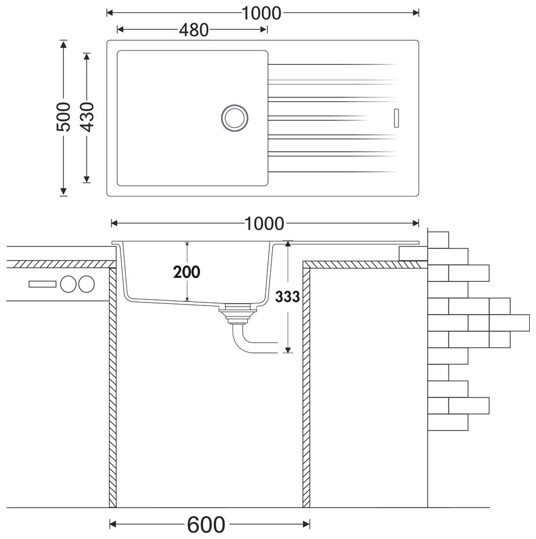 Einbauspüle. Composite, mit großem Becken und Abtropffläche, reversibel. 3½" Siebkorbventil mit Drehexzentergarnitur, verchromt.