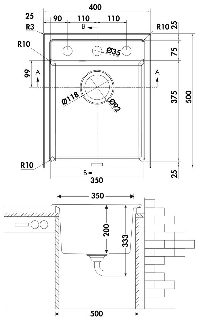 Einbauspüle. Composite, Einzelbecken. 3½" Siebkorbventil mit Drehexzentergarnitur, verchromt. 3 Vorbohrungen, Bohrungen müssen vor Ort durchgeschlagen werden.