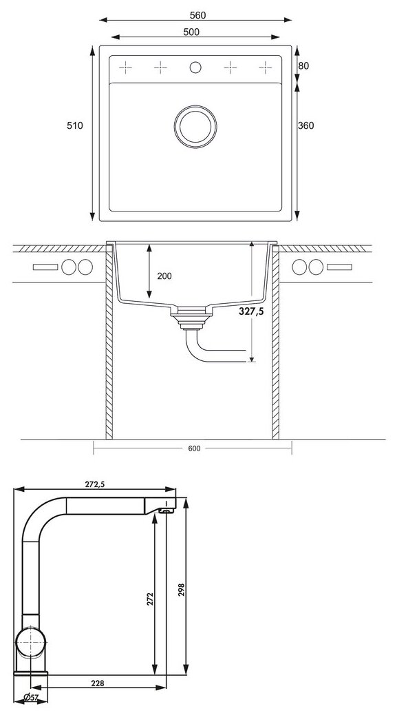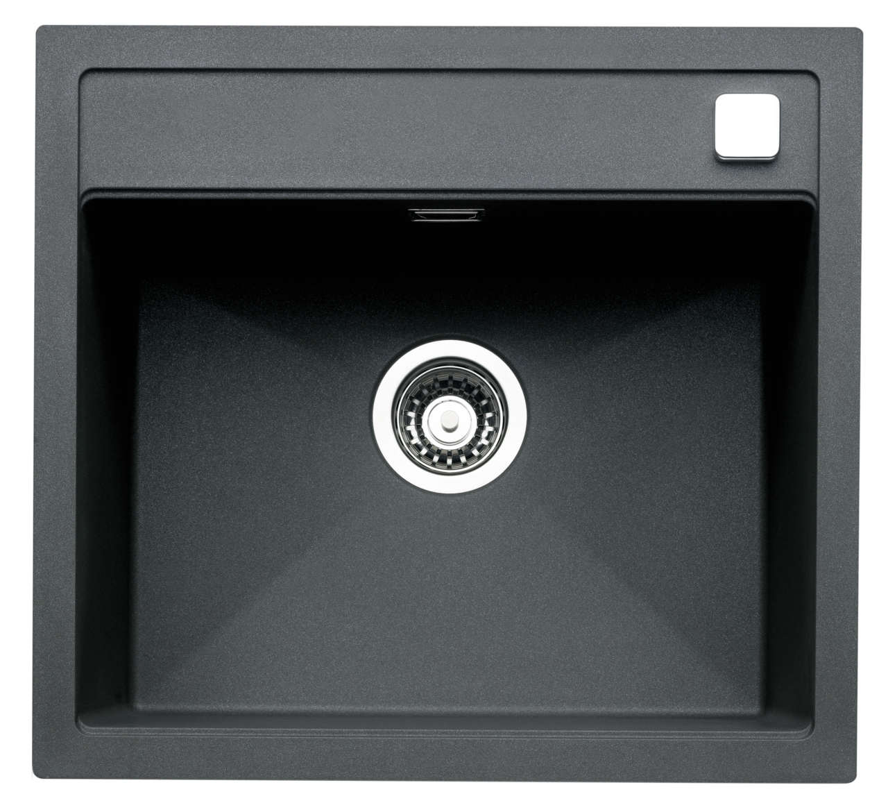 Einbauspüle. Composite, Einzelbecken. 3½" Siebkorbventil mit Drehexzentergarnitur, verchromt. 5 Vorbohrungen, Bohrungen müssen vor Ort durchgeschlagen werden.