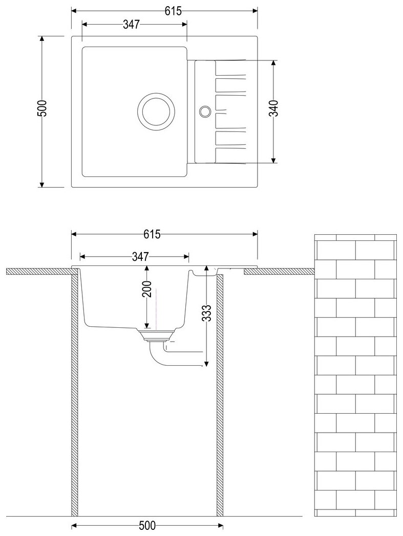 Einbauspüle. Composite, mit kleiner Abtropffläche, reversibel. 3½" Siebkorbventil mit Drehexzentergarnitur, verchromt.