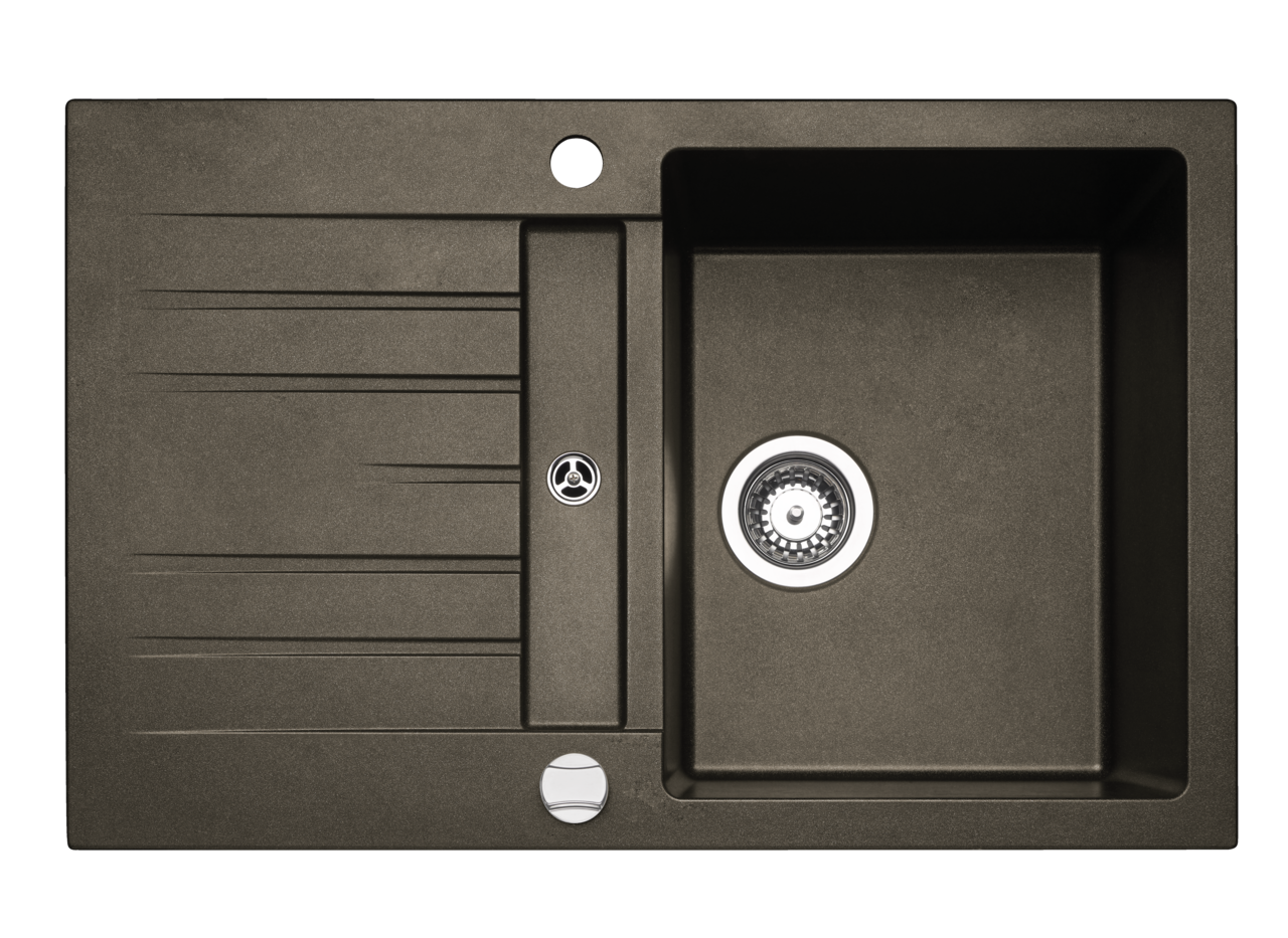 Einbauspüle. Composite, mit kleiner Abtropffläche, reversibel. 3½" Siebkorbventil mit Drehexzentergarnitur, verchromt.