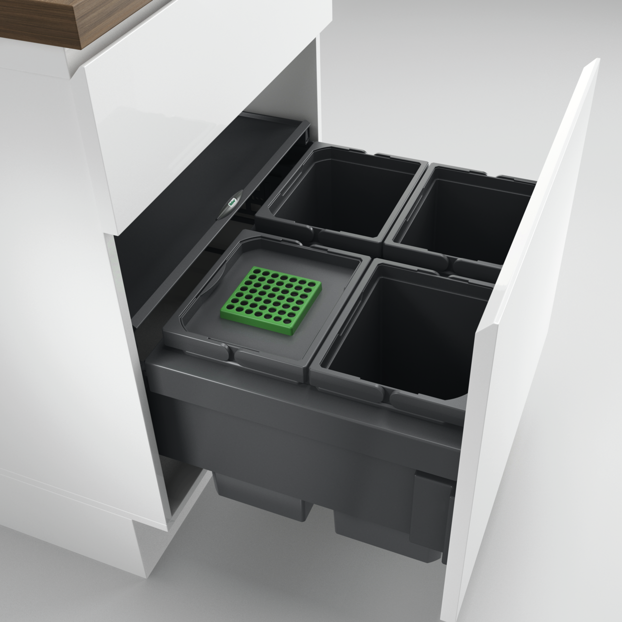 Sorgt für eine einfache Abfalltrennung in der Küche: Das Mülltrennsystem Cox® Base 360 S/600-4 mit Frontauszugsystem. Um verschiedene Wertstoffe und Abfälle zu sammeln und trennen, verfügt es über vier Mülleimer mit einem Abfallvolumen von jeweils 10 Litern. Durch den herausziehbaren Gesamtdeckel bleiben die Innenbehälter dabei dicht verschlossen, sodass keine Gerüche nach außen dringen. Der Deckel lässt sich praktischerweise auch als zusätzliche Ablage für unterschiedliche Utensilien einsetzen. Durch den Vollauszug bietet der Einbau-Abfallsammler eine komfortable Handhabung und lässt sich vollständig ausziehen. Für ein leises und sanftes Einziehen ist er sowohl mit einem Softeinzug als auch einer Dämpfung ausgestattet. Mit seinem quick&easy-Montagerahmen kann das Mülltrennungssystem passgenau an der Schrankwand montiert werden.