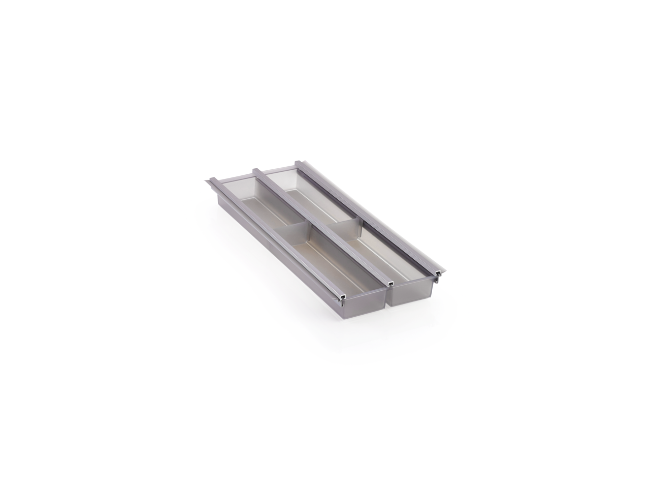 Besteckeinsatz. Für 300 mm Schubladenbreite. Weiß-transluzent mit Aluprofil sowie graphit-transluzent mit edelstahlfarbigem Profil.