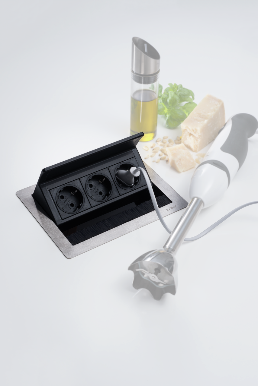 Mit der versenkbaren CON-AKTIV Evoline® FlipTop Push Einbausteckdose ist die nächste Stromquelle für den Stabmixer oder den Toaster immer in erreichbarer Nähe. Sie dient zum Einlassen in die Arbeitsplatte der Küche und ist mit drei Schutzkontakt-Steckplätzen ausgestattet. Bei Nichtgebrauch lässt sich das Element ganz einfach durch Schließen der Abdeckung einfahren. Ein leichtes Antippen des Deckels genügt, um ihn zu öffnen. Im geschlossenen Zustand fügt sich die rechteckige 3er-Steckdose flächenbündig und mit eleganter Edelstahloberfläche in die Arbeitsfläche ein. Durch den praktischen Bürsteneinsatz in der Front kann die Blende auch bei eingesteckten Kabeln geschlossen werden. Dadurch wird die Gefahr von eindringendem Spritzwasser oder anderen Verunreinigungen bei der Zubereitung von Speisen vermieden. Der Steckdoseneinsatz ist aus robustem Kunststoff in der Farbe Schwarz gefertigt. Der Kabelauslass befindet sich hinten links. Die Montage erfolgt in Arbeitsplatten mit einer Stärke von bis zu 50 mm. Dabei beträgt die gesamte Einbautiefe 68 mm. Die Fixierung erfolgt von unten. Zum Stromanschluss ist eine 3 m lange Netzanschlussleitung mit Schukostecker inklusive. Das Programm der CON-AKTIV Evoline® Steckdosen umfasst viele weitere Varianten, die sich kombinieren lassen.