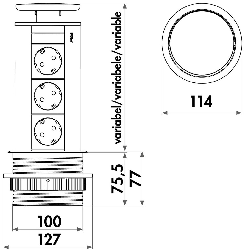 Energiebox. Versenkbar. Mit 3 Steckdosen für Hängeschränke oder Arbeitsplatten. Geführtes Herausziehen durch eine leicht zu drückende Taste, die auch beim Wiederverschließen die Leitung geordnet führt.