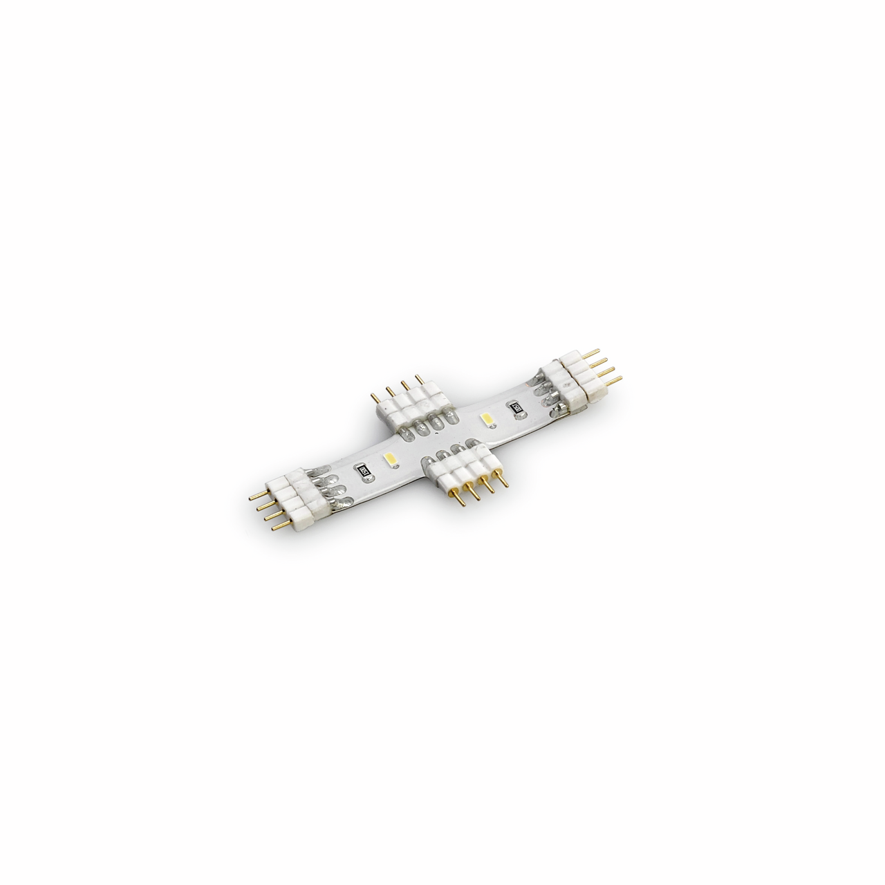 Mit dem LED Flex Kreuzverbinder Fakto lassen sich LED-Leuchtstreifen mühelos verzweigen. So kann die Ambientebeleuchtung in der Küchenzeile oder im Vitrinenoberschrank beliebig erweitert werden. Dabei verfügt der Verbinder ebenfalls über zwei LEDs in einem Abstand von 16,6 mm für eine unterbrechungsfreie Lichtstimmung. Sie sind in Silikon vergossen, wodurch eine robuste und unempfindliche Oberfläche entsteht. Geeignet ist die Verbindung für 10 mm breite LED-Stripes, die neutralweiß mit 4.000 K leuchten. Das Rastermaß beträgt 2,54 mm. Das Verbindungselement besitzt ein 4-poliges Stecksystem mit aufgesteckten Stiftleisten sowie allseitige Buchsenseiten. Eine individuelle Lichtgestaltung wird durch einen Zugang und drei Abgänge ermöglicht. Der Kreuzverbinder erfüllt die Energieeffizienzklasse G. Seine Montage kann werkzeugfrei durch Zusammenstecken erfolgen.