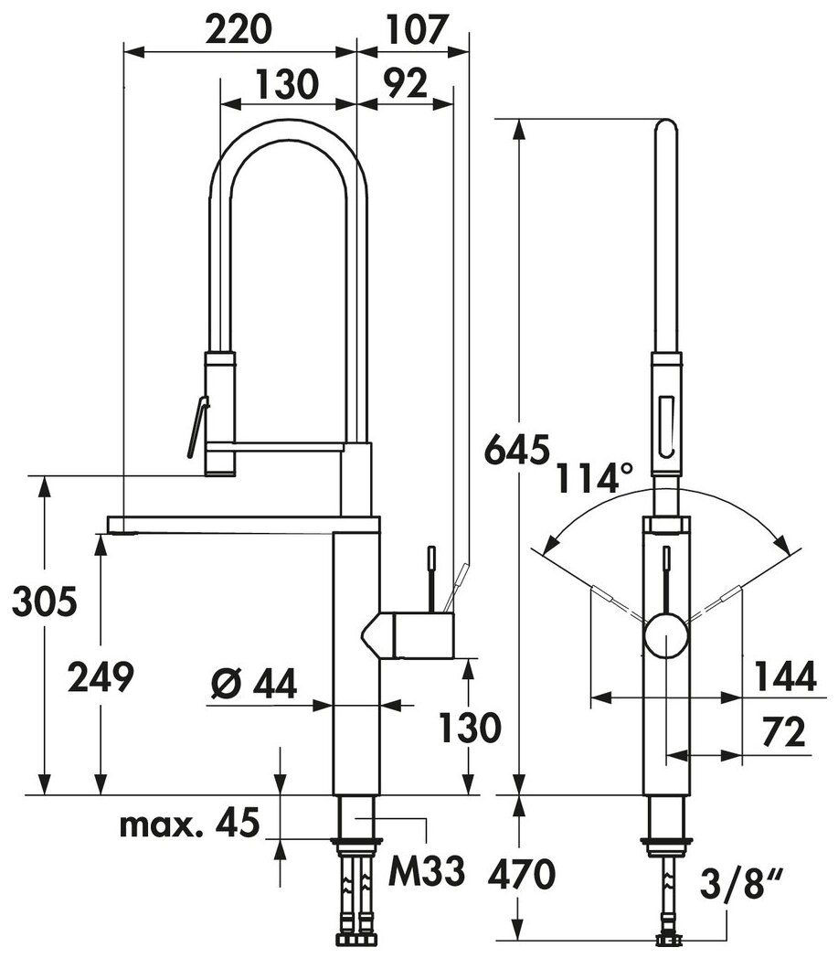 Einhebelmischer. Mit schwenkbarem Auslauf und federgeführter Schlauchbrause, seitlichem Hebel und Keramikkartusche.