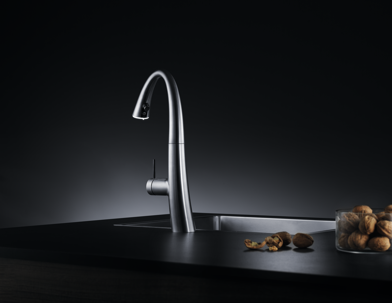 — Premium-Lifestyle Armatur mit scheinbar unsichtbar in den Auszugauslauf integriertem LED-Lichtring