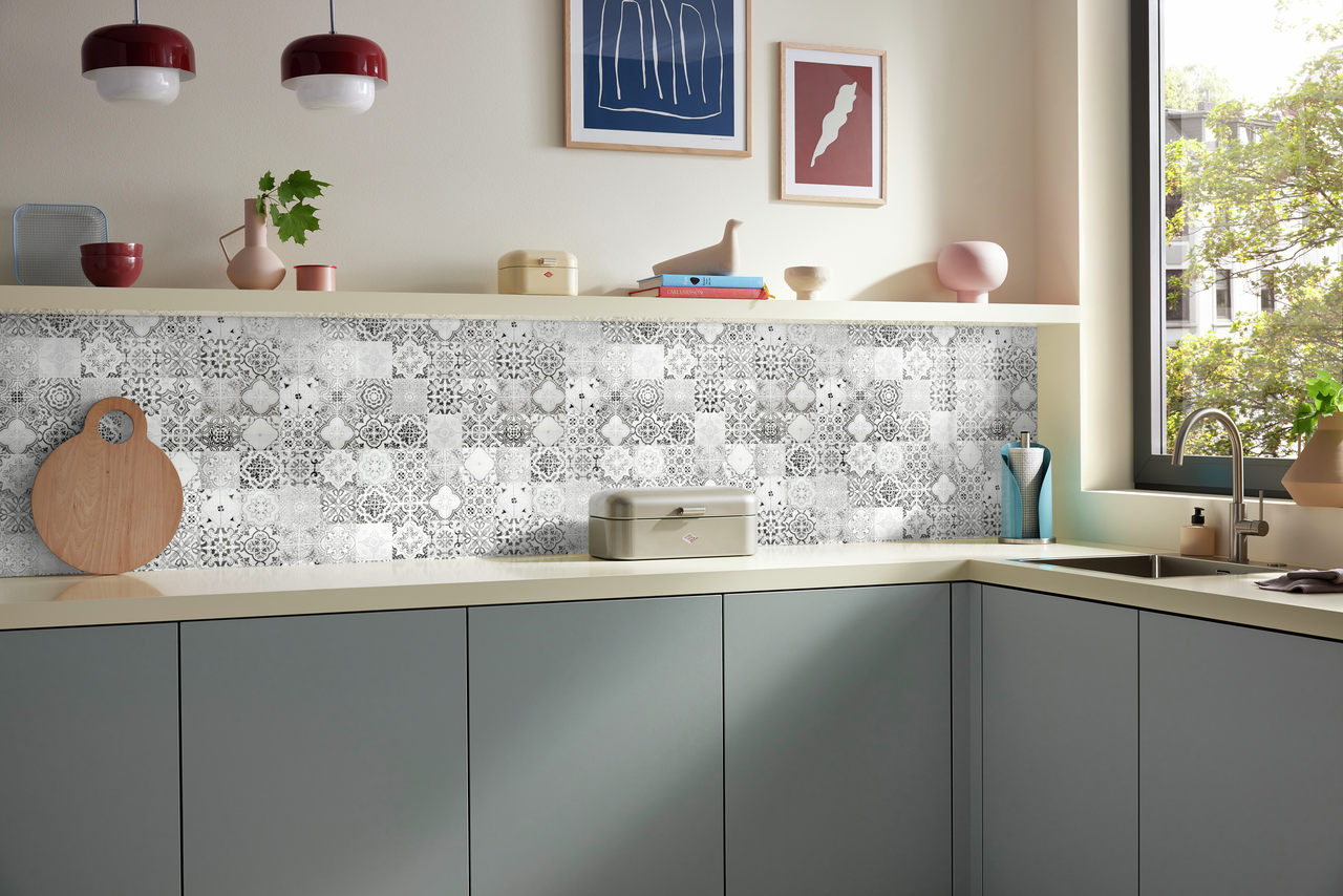 Ein attraktives Fliesen-Motiv in einem dezenten Grauton kennzeichnet die Küchenrückwand PICit® 131. Der dekorative Spitzschutz stellt einen effektvollen Kontrast zum Küchenkorpus her und setzt einen stilvollen Akzent. Dank der UV-Druckschutzlaminierung bietet er unempfindliche und leicht zu reinigenden Oberflächen. Bis zu einem Standardmaß von 700 x 3050 mm (H x B) lässt sich die Plattengröße online variieren. Sondergrößen sind auf Anfrage lieferbar. Mit den Naber Kollektionen PICit® und BASICit® stehen hochwertige Nischenrückwände zur Verfügung, die sich beliebig anpassen lassen. So ermöglicht der interaktive Naber Nischenrückwand-Konfigurator eine Individualisierung der Platte einschließlich Bildausschnitt, Stärke und Ausführung. Um kundeneigene Bilder als Rückwand zu realisieren, kann das MySCENEit®-Tool im Konfigurator zum Einsatz kommen.