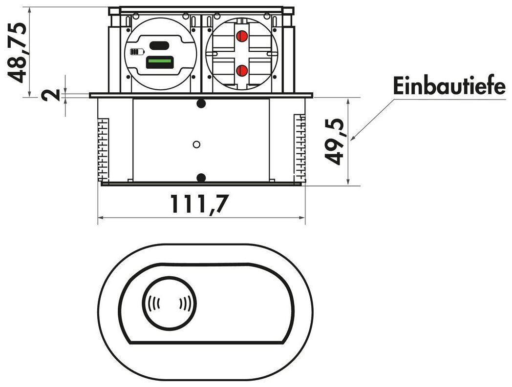 Steckdosenelement. Versenkbar. Mit 1 Schukosteckdose, Doppel USB Charger A/C und QI Ladefunktion im Deckel. Für den Einbau in Arbeitsplatten.