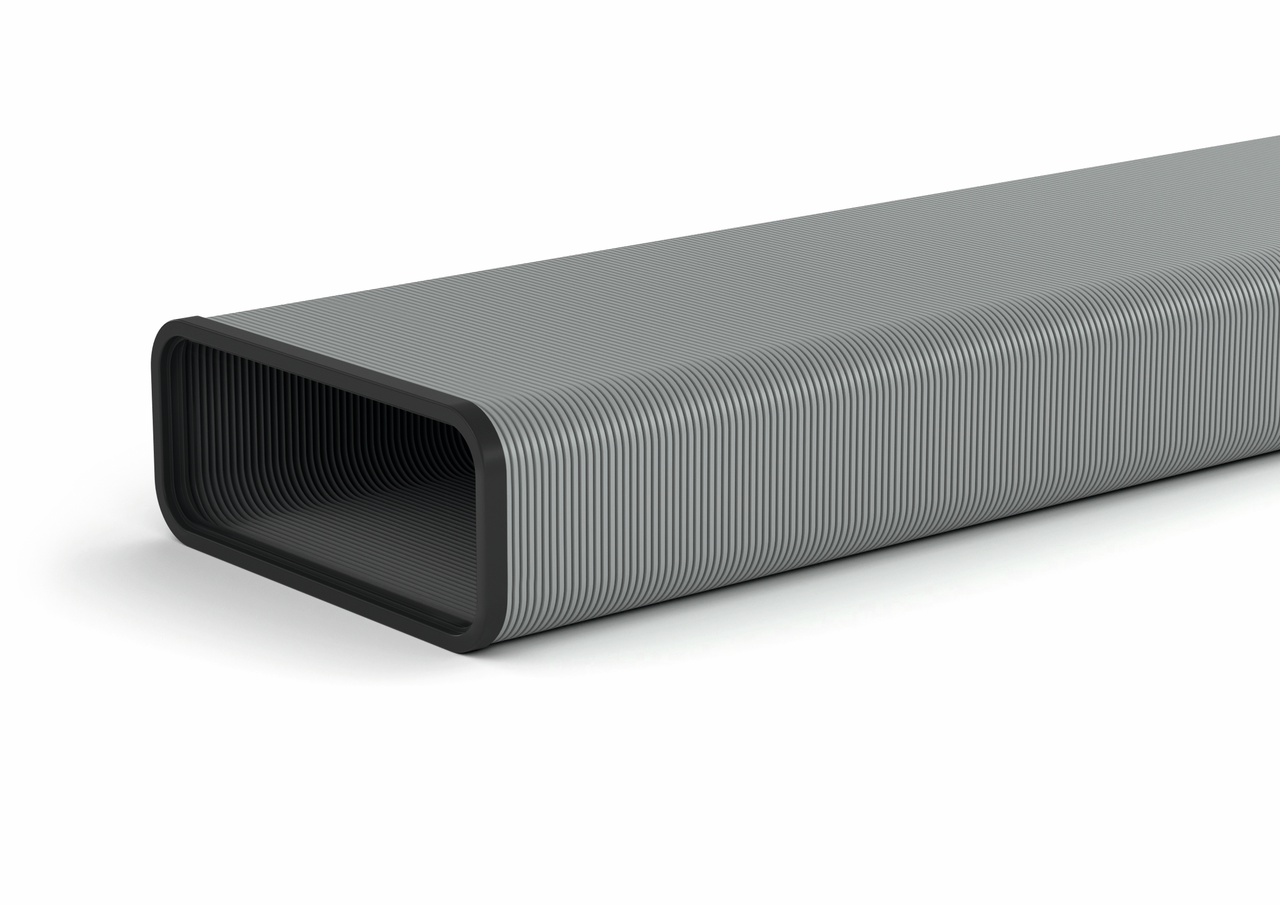 Das COMPAIR® STEEL flow SF-VRO flex 150 Flachkanalrohr wird in langlebiger Qualität aus nicht brennbarem Material gefertigt. Dank der flexiblen Eigenschaften eignet es sich beispielsweise für Rohrbögen (&lt - 90°) sowie einen parallelen Versatz innerhalb des Lüftungssystems. Erfordern es die baulichen Gegebenheiten, lässt sich das Lüftungsrohr kürzen. Auf beiden Seiten sind SF-Profildichtungen vormontiert, sodass sich ein Anschlussmaß von 216 x 83 mm ergibt. Werden die Dichtungen entfernt, ist eine Verbindung mit Flachkanälen aus Kunststoff problemlos möglich.