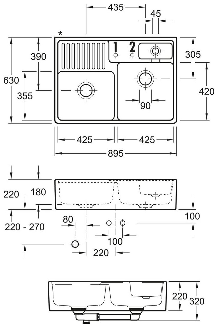 — Spülbecken wird mit 2-Lochbohrungen (1 + 2) geliefert