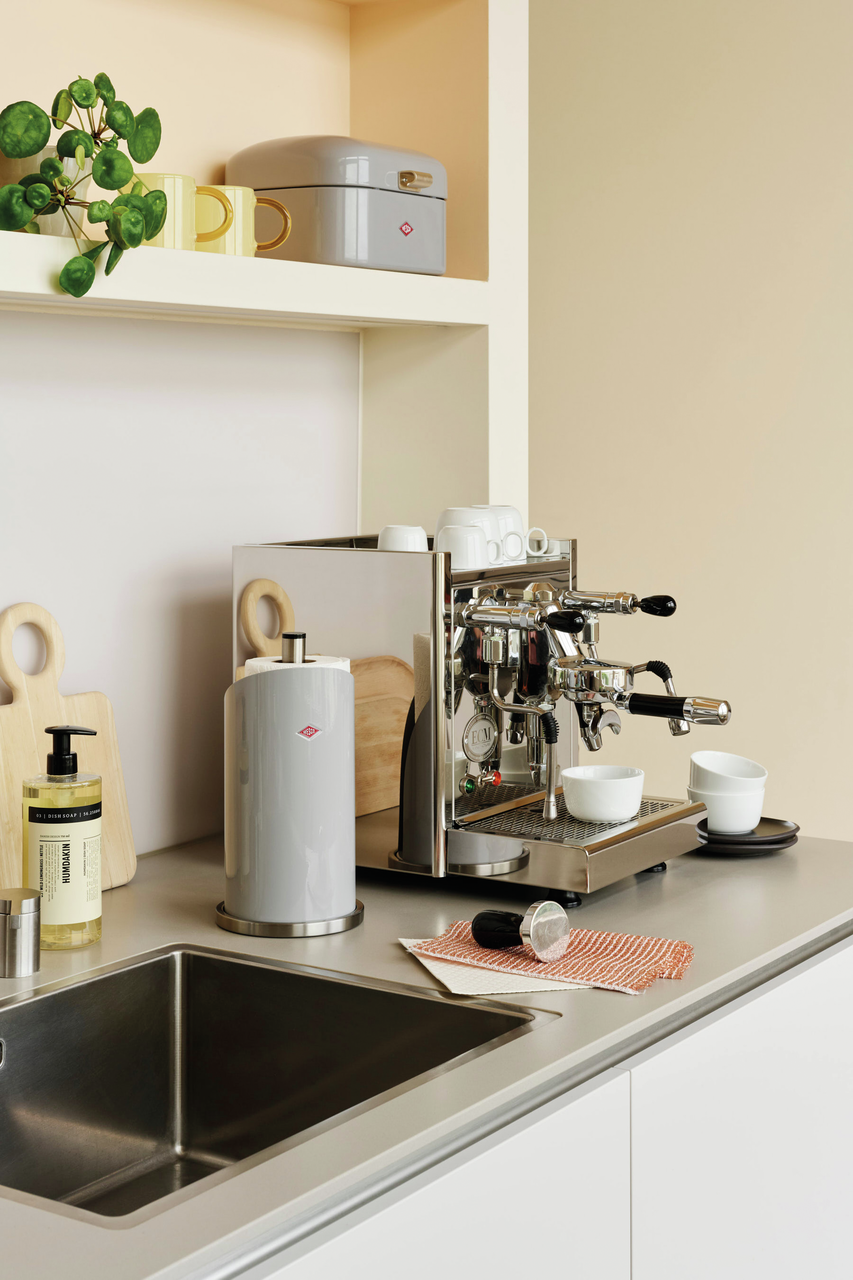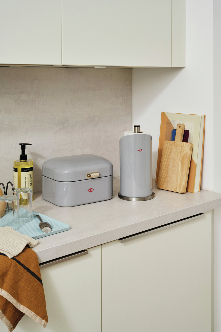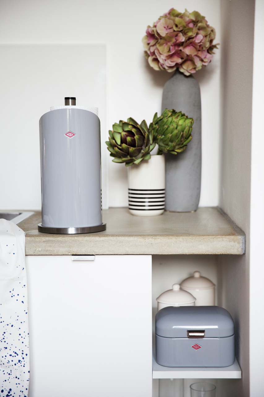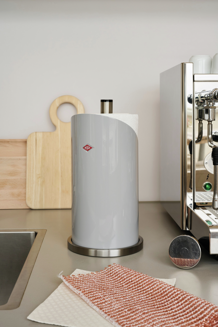 Hat Ihre Küchenpapierrolle noch keinen festen Standplatz in Ihrer Küche? Dann wird es höchste Zeit für diesen praktischen Rollenhalter im typischen Wesco-Materialmix aus Edelstahl und farbig lackiertem Stahlblech.