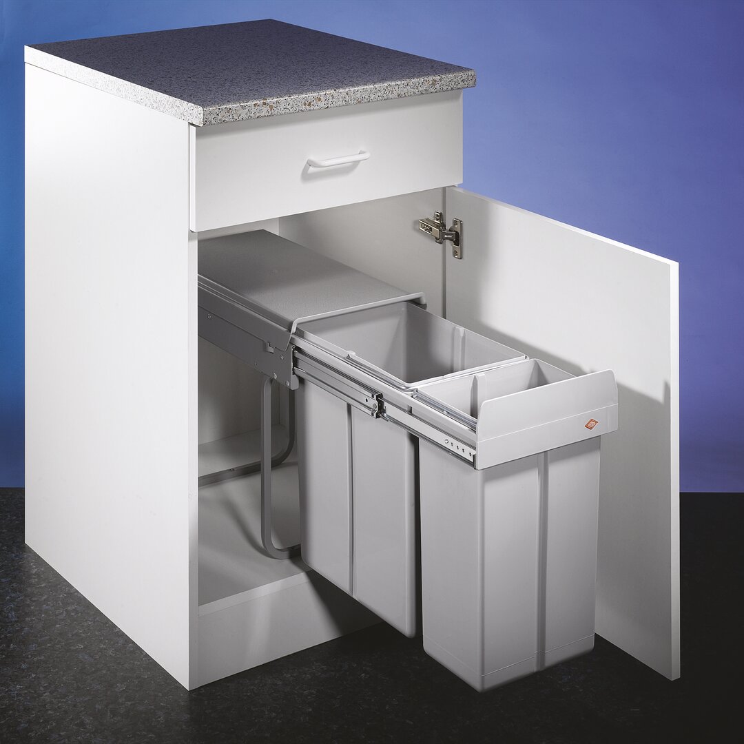 Mithilfe des funktional und durchdacht konzipierten Mülltrennsystems Double 3 kann Biomüll und sonstiger Abfall hygienisch entsorgt werden. Das System kommt in Kombination mit Drehtür-Schränken zum Einsatz. Die minimale Einbaubreite liegt bei 300 mm. Bei breiteren Unterschränken bleibt Abstellfläche beispielsweise für Putzmittel und weitere Utensilien erhalten. Das Set umfasst zwei Mülleimer mit einem Volumen von jeweils 20 und 10 Liter und deckt damit den üblichen Bedarf kleinerer Haushalte. Ein robuster Vollauszug mit leichtgängigen Laufleisten erleichtert den Gebrauch, da die Müllbehälter zum Entleeren mühelos herausnehmbar sind. Sie werden aus Materialien gefertigt, die hohen Hygieneansprüchen gerecht werden. Die Montage des Tragegestells erfolgt auf dem Schrankboden. Der über die gesamte Länge fest verankerte Deckel umfasst beide Abfallsammler und kann als zusätzliche Ablage genutzt werden.