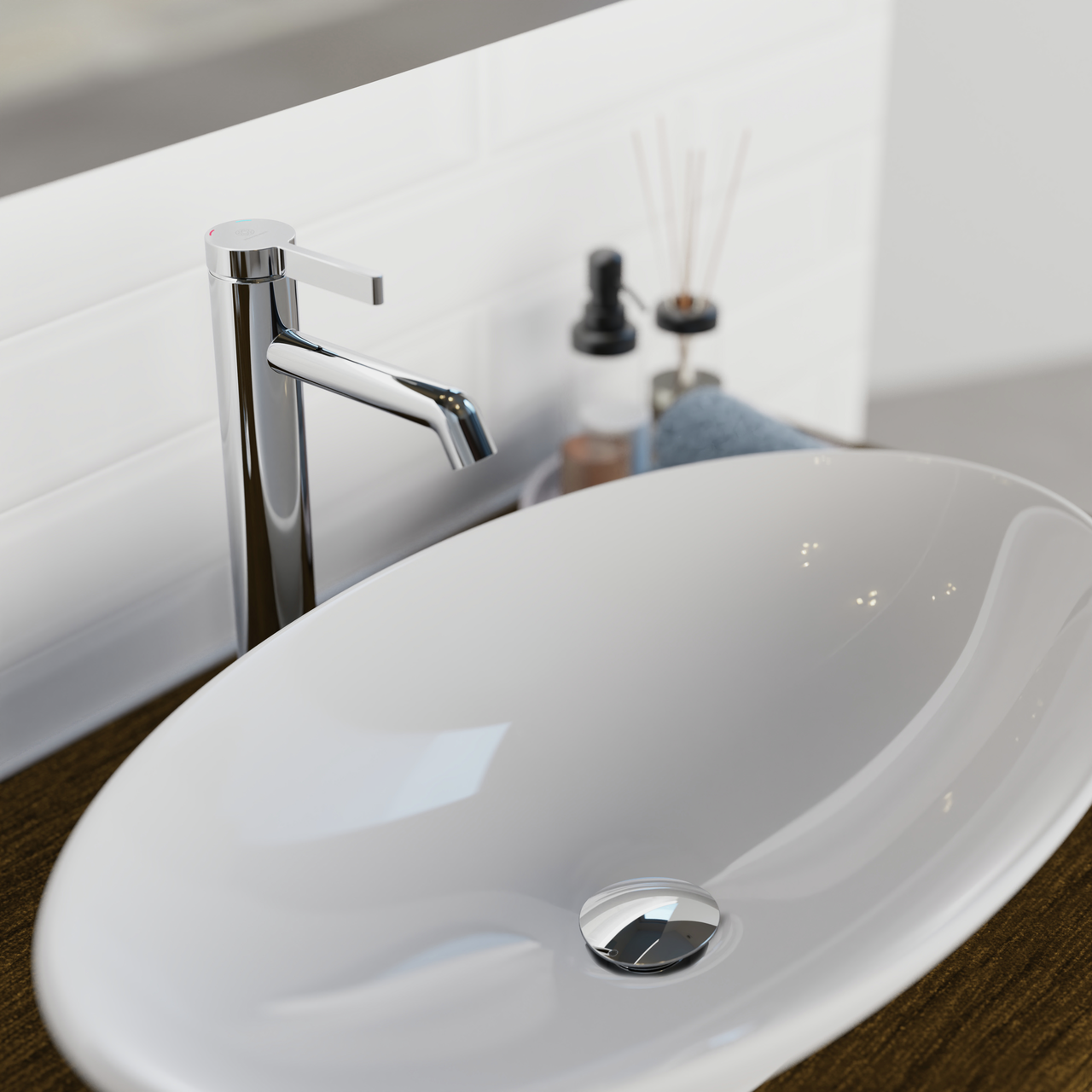 Einhebelmischer. Mit Zugstangen-Ablaufgarnitur 1¼" und Keramikkartusche. Besonders geeignet für den Einsatz mit Aufsatzwaschbecken.