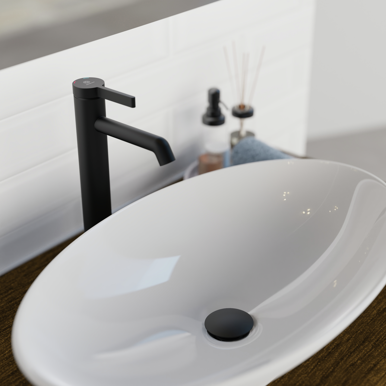 Einhebelmischer. Mit Zugstangen-Ablaufgarnitur 1¼" und Keramikkartusche. Besonders geeignet für den Einsatz mit Aufsatzwaschbecken.