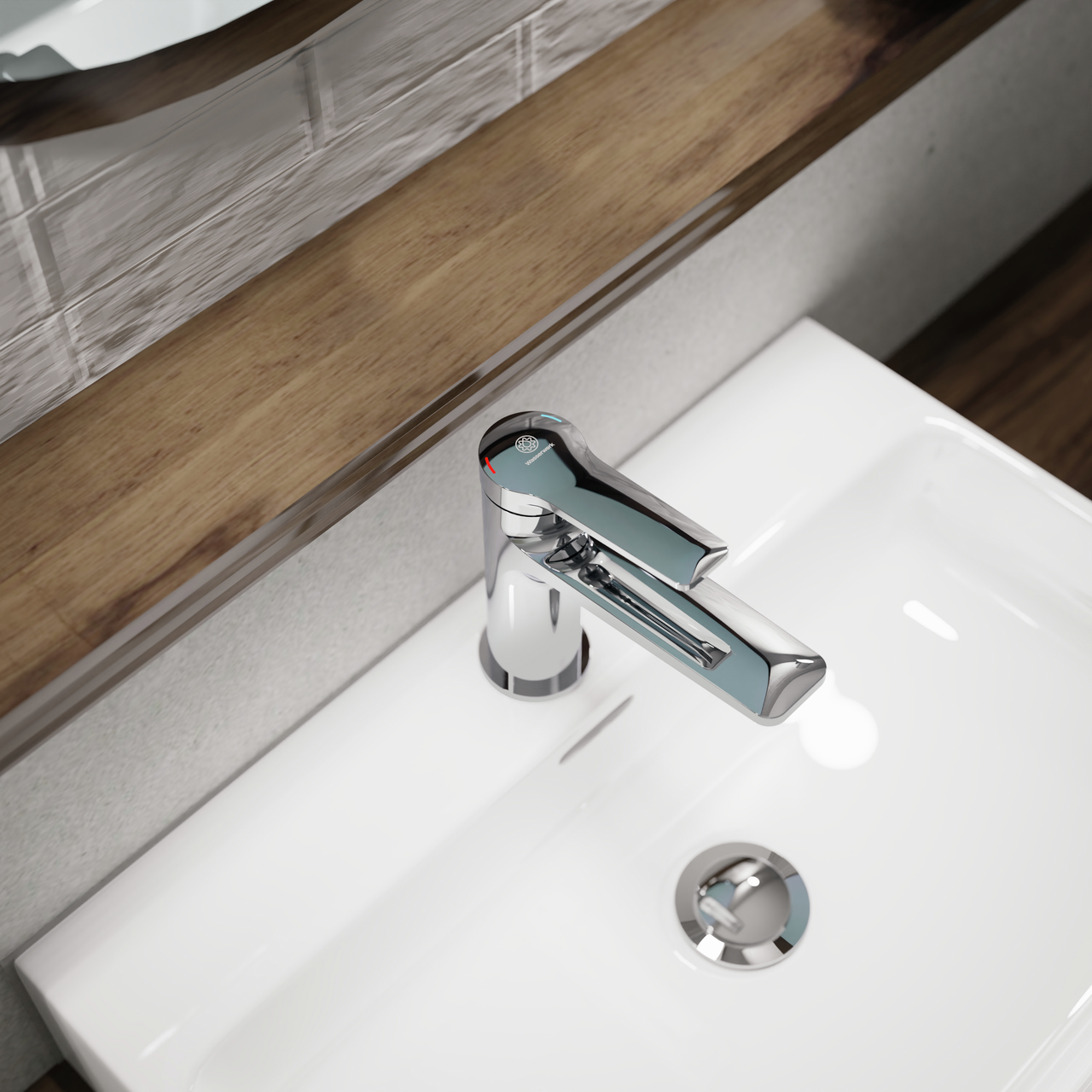 Einhebelmischer. Mit Zugstangen-Ablaufgarnitur 1¼" und Keramikkartusche. Inkl. NEOPERL®-Mischdüse CASCADE® SLC mit Antikalkfunktion.
