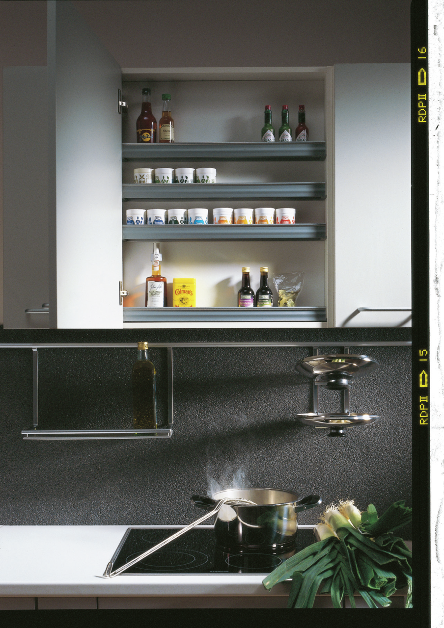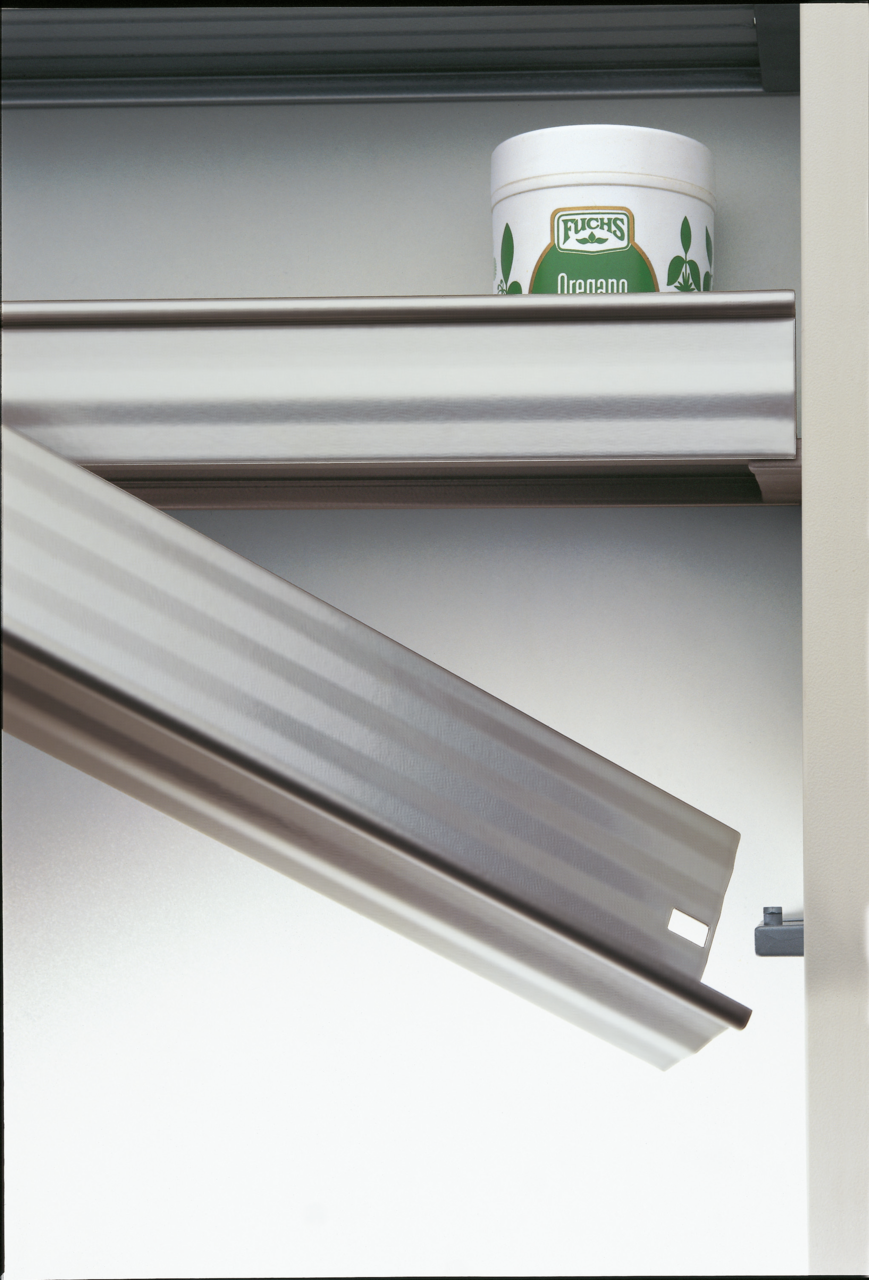 Mit der schmalen Ablage lässt sich der Dunstabzugshaubenschrank ideal ausstatten. Dadurch kann der Stauraum im Schrank optimal genutzt werden. Das Ablageelement besitzt die ideale Breite, um Gewürzdosen und andere Kleinutensilien übersichtlich zu verstauen. Dabei ermöglicht die niedrige Vorderkante eine gute Sicht auf den Inhalt und eine mühelose Entnahme. Die Hängeschrankausstattung wird einfach an der gewünschten Stelle im Schrank auf die Bodenträger gesteckt. Die passenden Träger sind bereits im Lieferumfang enthalten. Geeignet ist die Ablage für Seitenwände der Stärken 16 oder 19 mm.