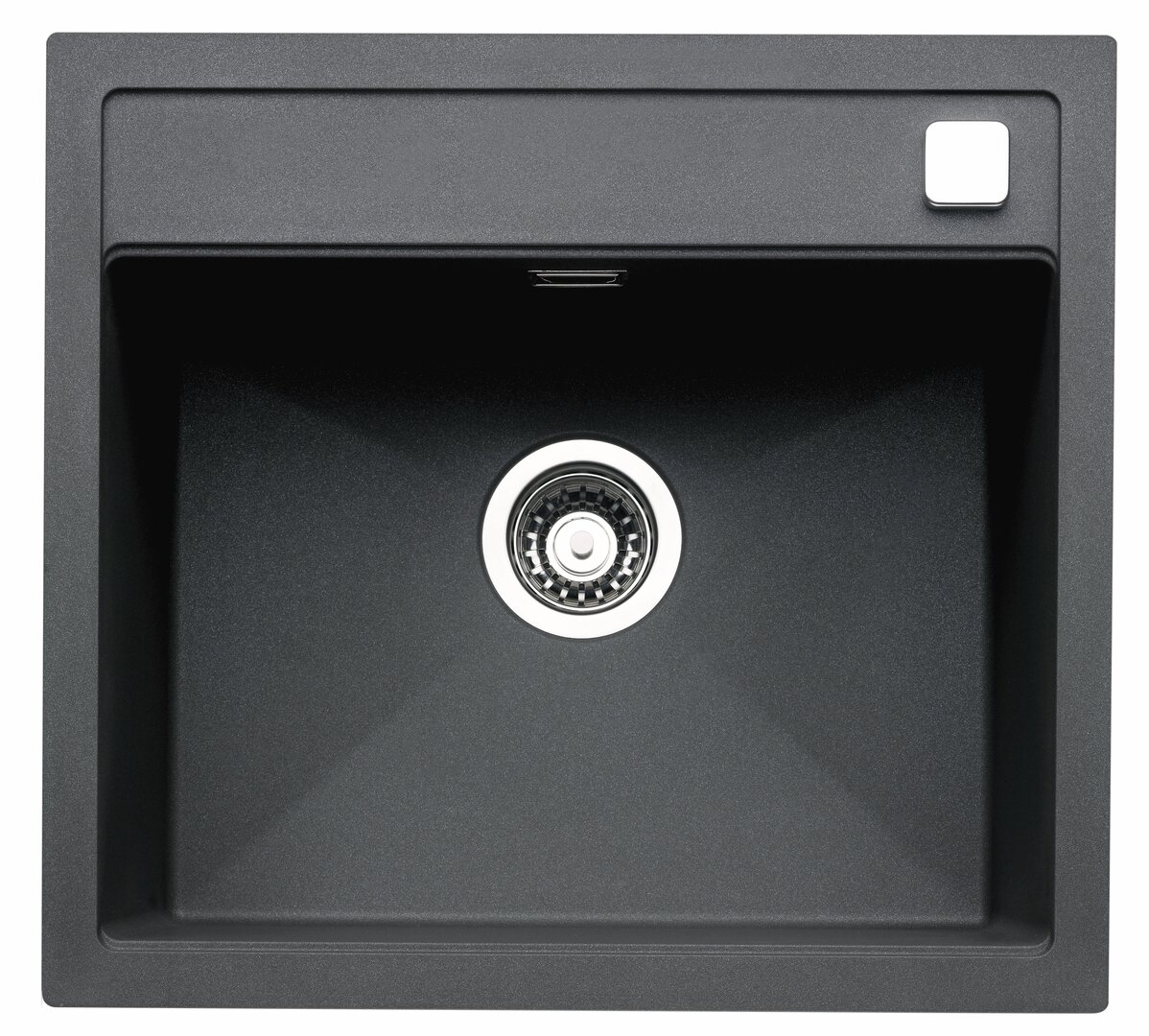Einbauspüle. Composite, Einzelbecken. 3½" Siebkorbventil mit Drehexzentergarnitur, verchromt. 5 Vorbohrungen, Bohrungen müssen vor Ort durchgeschlagen werden.