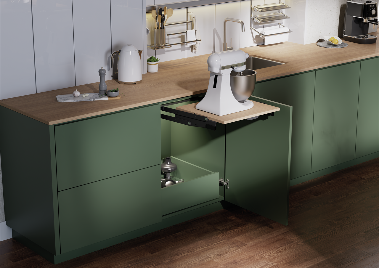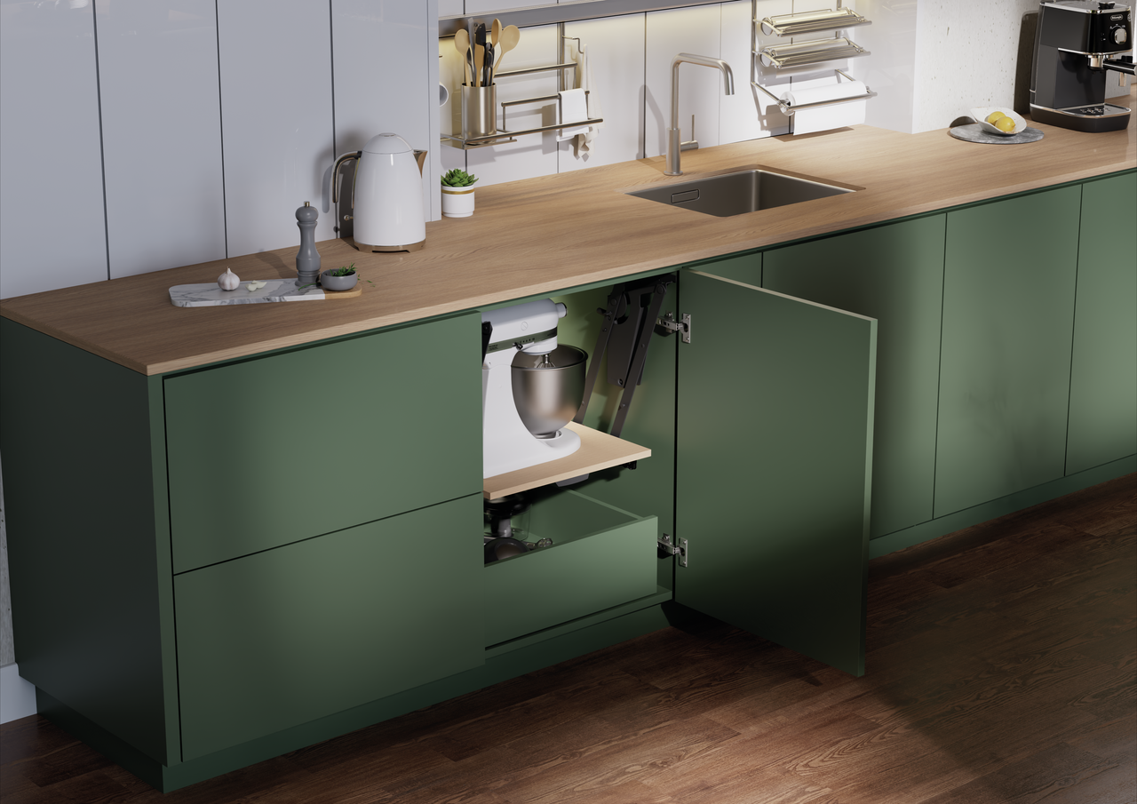Der ChefsTable Schwenkbeschlag ist die ideale Lösung für eine durchdachte Schrankausstattung in modernen Küchen. Mit einer Tragkraft von 16 kg unterstützt er eine sichere und flexible Nutzung von Schrankinhalten. Der integrierte Selbsteinzug sorgt dafür, dass Türen sanft und geräuschlos schließen, was den Komfort im Alltag deutlich erhöht. Dank seiner robusten Konstruktion ist der Schwenkbeschlag besonders langlebig und zuverlässig, selbst bei häufiger Nutzung. Die Montage hinter scharnierten Türen schafft ein aufgeräumtes Erscheinungsbild, während der stufenlos einstellbare Mechanismus die Anpassung an unterschiedliche Schrankbreiten ermöglicht. Diese Kombination aus Funktionalität, Stabilität und praktischem Design erleichtert den Zugriff auf Schrankinhalte und sorgt für eine effiziente Organisation. Mit dem ChefsTable Schwenkbeschlag wird jede Schrankausstattung zu einer flexiblen und komfortablen Lösung.