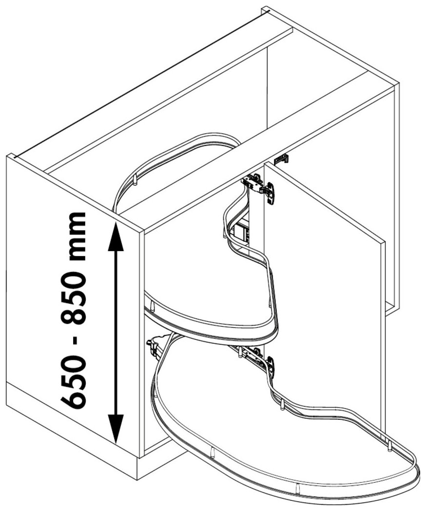 Eckschrank-Schwenkbeschlag zur Aufnahme von Tablaren.