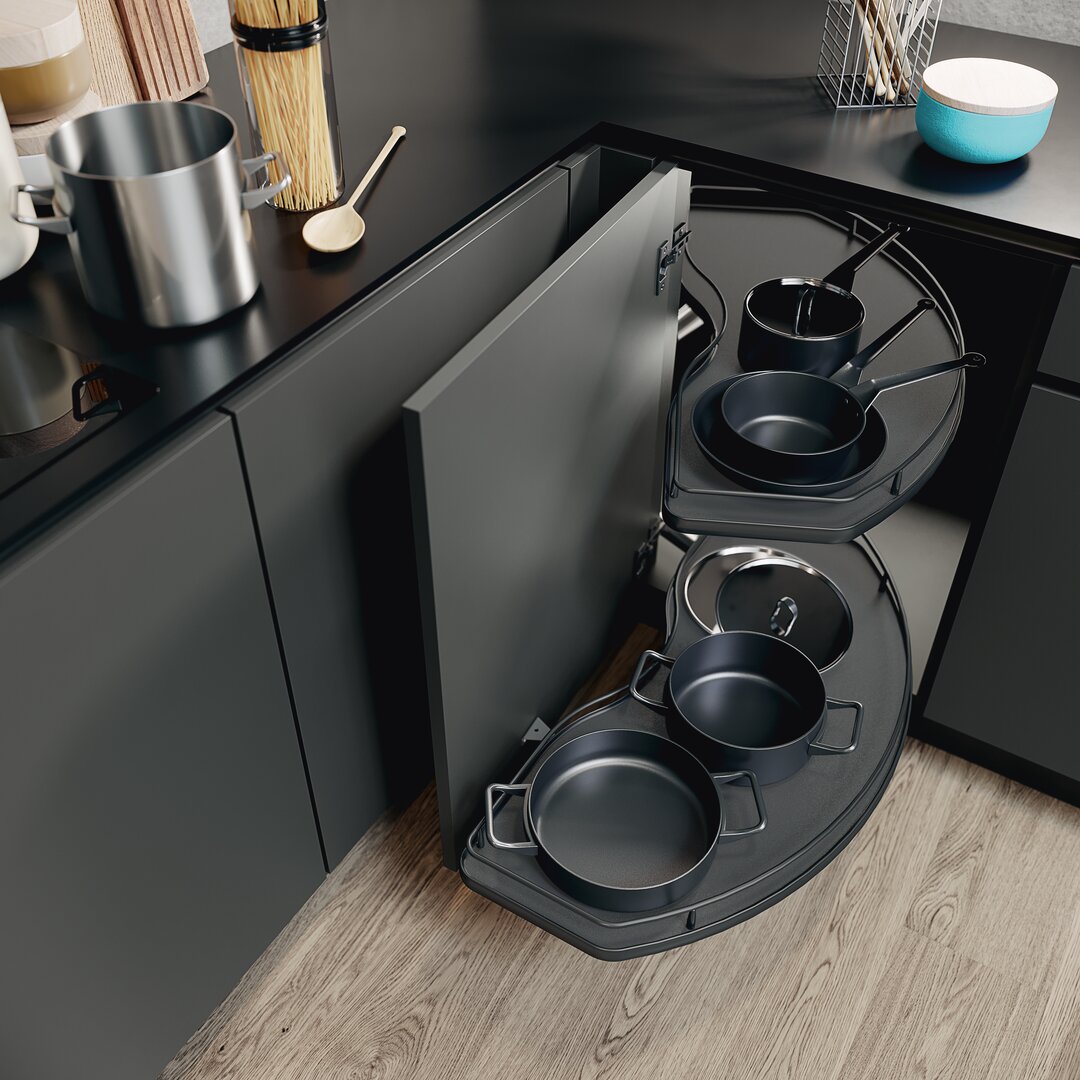 Eckschrank-Schwenkbeschlag zur Aufnahme von Tablaren.