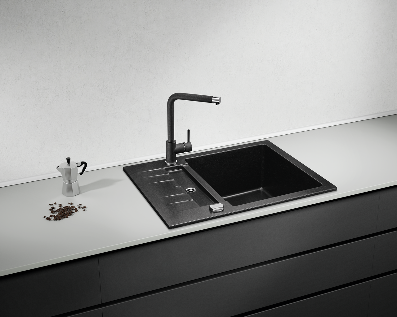 Die Composite-Einbauspüle Corto 615 verbindet einfache Ästhetik mit einem hohen Maß an Funktionalität. Die Optik wird maßgeblich durch den eleganten und vielseitig kombinierbaren Granit-Look geprägt. Hinzu kommen geradlinige Konturen, die sich bei der Integration in die Küchenzeile bemerkbar machen. Die Spüle ist mit einer kleinen, leicht abgewinkelten und geriffelten Abtropffläche ausgestattet. Sie dient zum Ablegen von Besteck und weiteren Utensilien, wobei abtropfendes Wasser direkt in das Ablaufbecken fließt. Im Hauptbecken befindet sich ein Siebkorbventil, das über die verchromte Exzentergarnitur bedient wird. Die Einbauspüle wird mit modernster Technik aus widerstandsfähigem Verbundwerkstoff gefertigt. Aufgrund des hohen Anteils an Quarzstein erweisen sich die Oberflächen als äußerst kratzfest, fleckenfest und pflegeleicht. Dank der Materialbeschaffenheit eignet sie sich zur Nutzung in Kombination mit einer Heißwasser-Garnitur bis 100 °C. Ebenso ist die Spüle im Set mit einer zur Farbpalette passenden Hochdruck-Garnitur erhältlich. Für mehr Flexibilität wird durch beidseitig vorhandene Bohrungen gesorgt. Sie erlauben den Einbau der Einzelspüle mit einem nach links oder rechts ausgerichteten Becken.