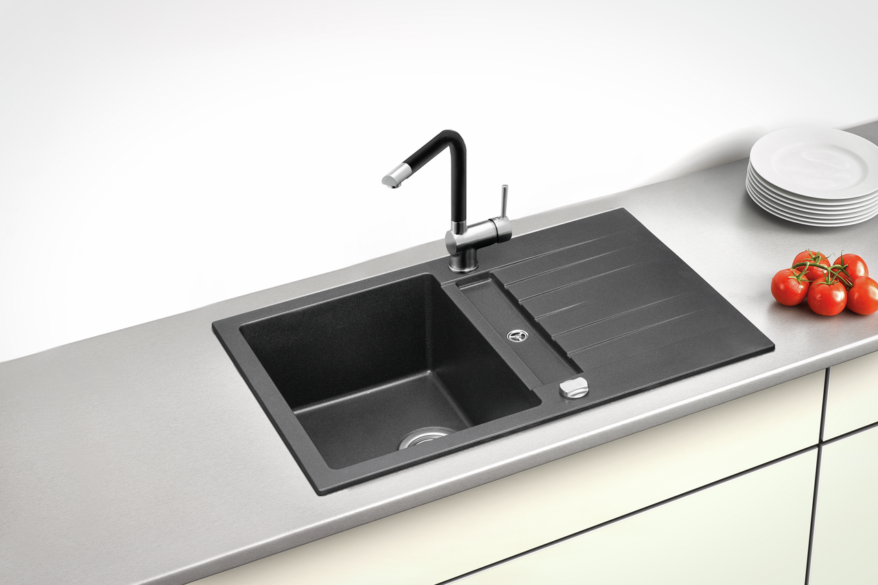 In einem zeitlos eleganten Granit-Look gehalten, ist die Composite-Einbauspüle Corto 780 eine optische Bereicherung für die Küchenzeile. Das Hauptbecken wird durch eine geriffelte Abtropffläche ergänzt, welche sich optimal zum Abstellen des gespülten Kochgeschirrs eignet. Mit dem passendem Zubehör lässt sie sich ebenso in eine zusätzliche Arbeitsfläche zum Schneiden von Obst und Gemüse umfunktionieren. Neben den optischen und funktionalen Aspekten überzeugt die Spüle durch eine widerstandsfähige Oberfläche mit einer angenehmen Haptik. Der bei der Fertigung verwendete Verbundwerkstoff mit hohem Quarzanteil eignet sich dank der Materialeigenschaften ideal zur Nutzung einer Heißwasser-Armatur bis 100 °C. Beidseitig vorhandene Bohrungen erlauben einen reversiblen Einbau mit dem Becken auf der linken und rechten Seite. Das Siebkorbventil mit verchromter Drehexzentergarnitur im Becken gehört zur Grundausstattung. Um die Optik der Einbauspüle im Granit-Look zu vereinheitlichen, stehen passend zur Farbpalette formschöne Hochdruck-Armaturen zur Verfügung.