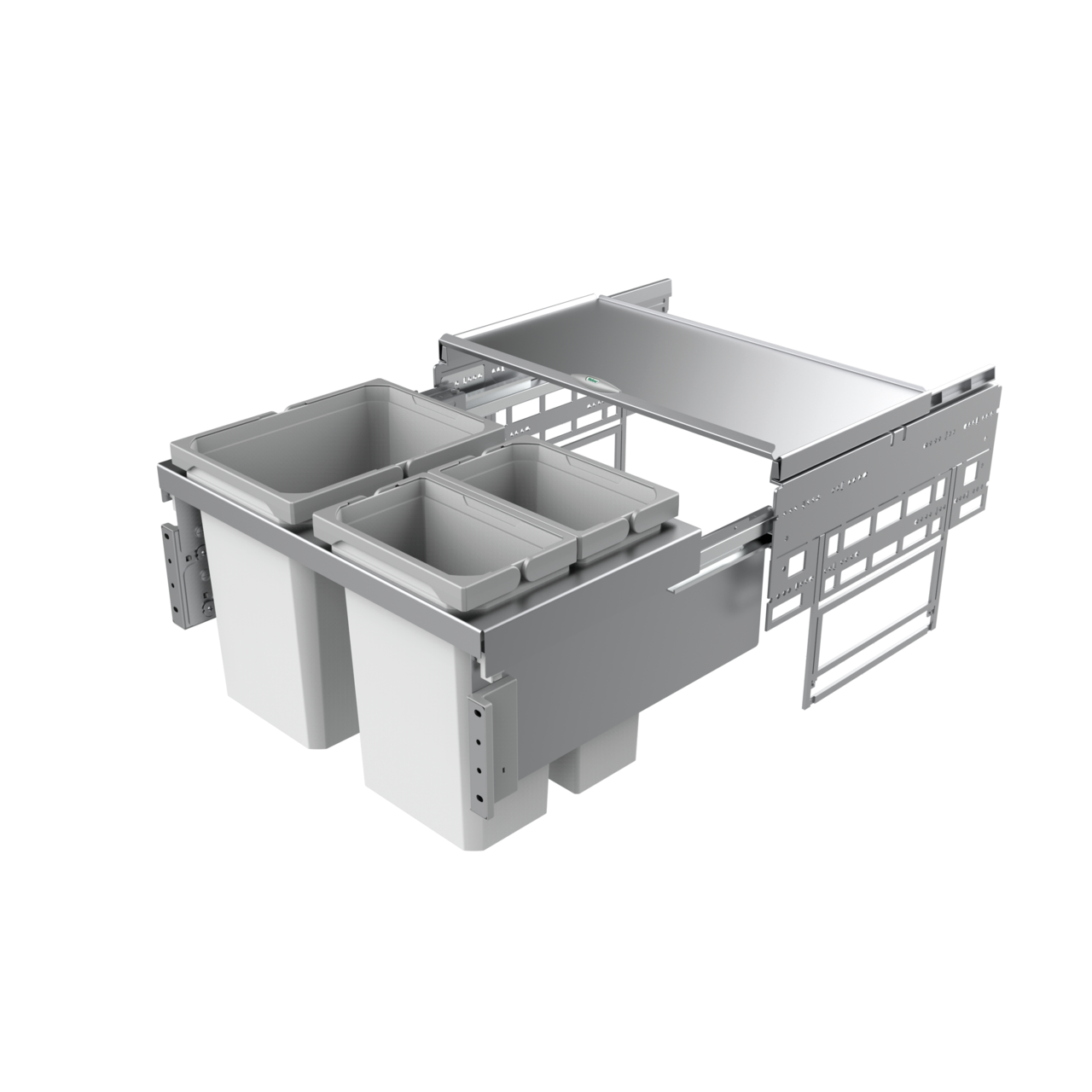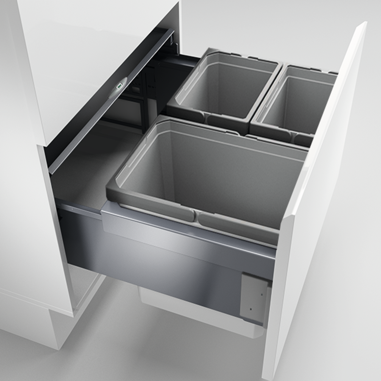 Das Mülltrennsystem Cox® Base 360 K/600-3 zeichnet sich durch einen hohen Komfort bei der Handhabung aus und ist für Küchenschränke mit Frontauszug geeignet. Dank der geringen Einbautiefe lassen sich problemlos Geräte wie beispielsweise Boiler hinter dem Abfallsammler einbauen. Für die Entsorgung und Trennung von Abfällen stehen je zwei Behälter mit einer Größe von 7,5 Litern und ein Mülleimer mit einem Fassungsvermögen von 15,5 Litern zur Verfügung. Der herausziehbare Gesamtdeckel bietet einen zuverlässigen Verschluss und minimiert die Bildung von Gerüchen. Auch als zusätzliche Ablagefläche für diverse Utensilien lässt sich der Deckel einsetzen. Durch den Vollauszug ist der Einbau-Abfallsammler vollständig ausziehbar und ermöglicht einen komfortablen Zugriff auf die Innenbehälter. Für ein sanftes und leises Einziehen sorgen die integrierte Dämpfung und der Softeinzug. Das Mülltrennungssystem lässt sich mit dem quick&easy-Montagerahmen passgenau an der Schrankwand montieren.