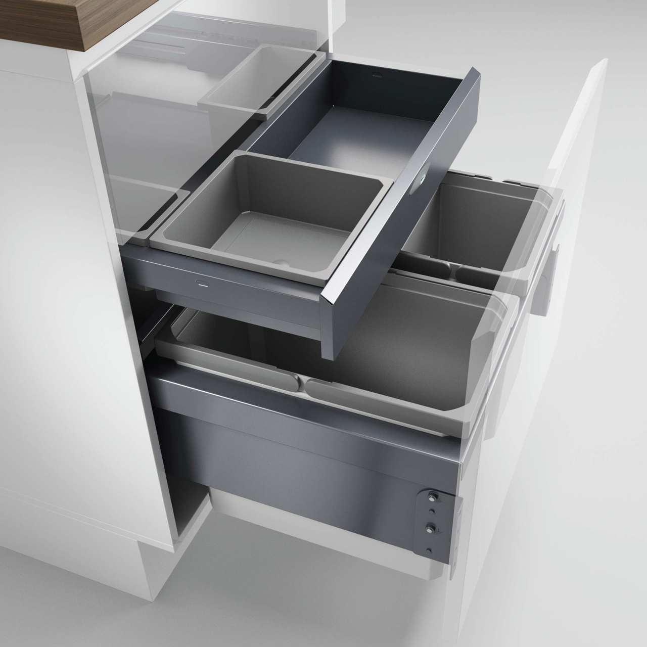 Mithilfe des Mülltrennsystems Cox Base 360 S/600-3 inklusive Base-Board wird der verfügbare Platz im eigenen Auszugsschrank effizient ausgereizt. Es wurde speziell für Küchenschränke mit Frontauszug mit einer Breite von 600 mm designt. Für eine komfortable Abfallsortierung stellt es gleich drei getrennte Behälter mit einem Gesamtvolumen von 42 Litern zur Verfügung. Dabei nimmt der große Eimer 22 Liter auf und die zwei kleineren jeweils 10 Liter. Im eingeschobenen Zustand werden alle Behälter durch die feststehende Gehäuseabdeckung verschlossen. Die in das Mülltrennsystem integrierte Vollauszugstechnik mit Softeinzug und Dämpfung sorgt dabei für ein sanftes wie leises Schließen. Oberhalb der Mülltrennung befindet sich das flache, separat ausziehbare Schubfach aus pulverbeschichtetem Metall. Es ist mit zwei Aufbewahrungsboxen ausgestattet, die individuell angeordnet werden können. Sie dienen zur Unterbringung von Müllbeuteln und anderen Kleinteilen. Zur Ausstattung gehört eine Quick & Easy Montageplatte, die eine unkomplizierte Befestigung an der Schrankwand sowie der Frontblende ermöglicht.