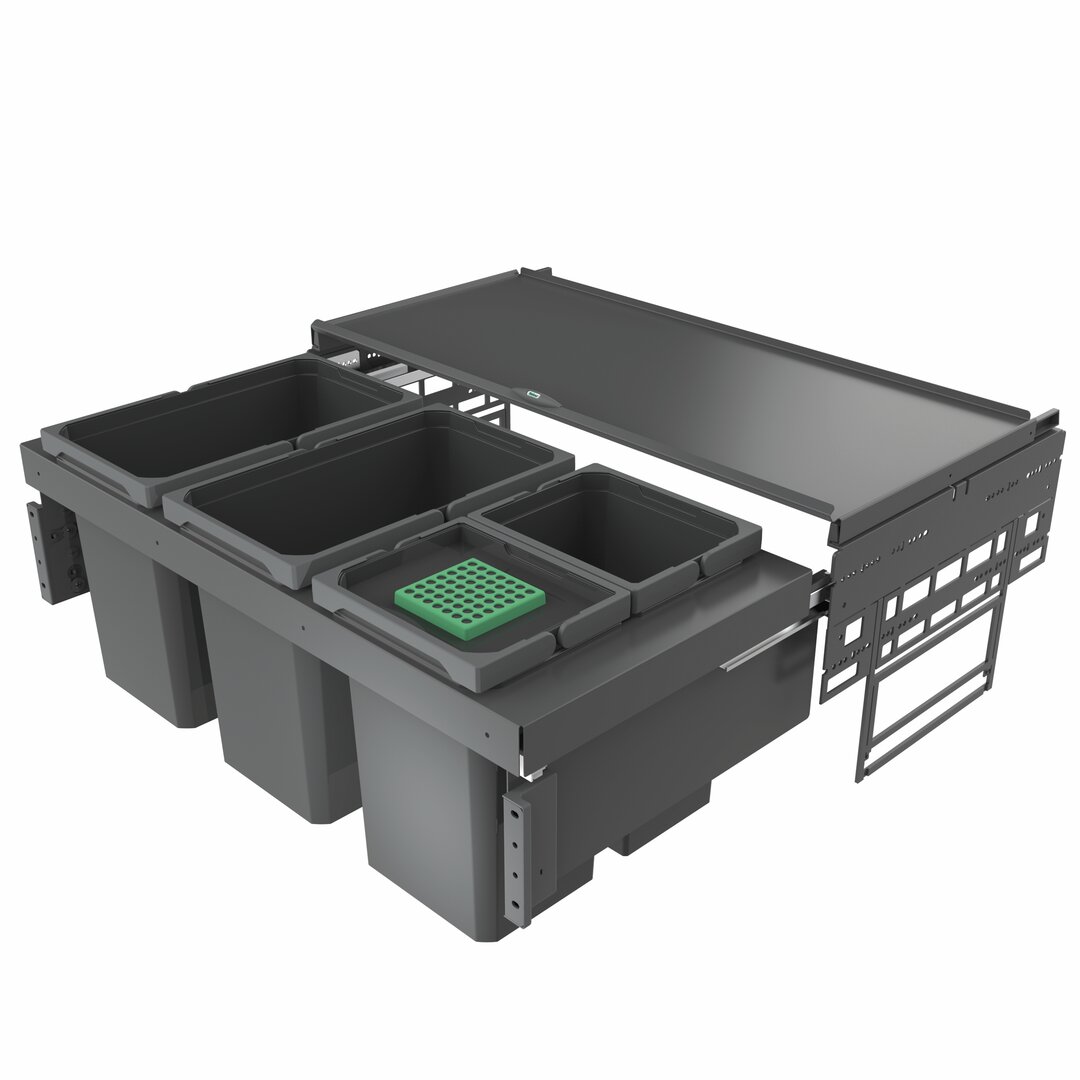 Das Mülltrennsystem Cox® Base 360 S/900-4 für Schränke mit Frontauszug ist ein praktischer Helfer, um Abfälle und Wertstoffe in der Küche zu sammeln und trennen. Dafür werden vier Abfallbehälter in zwei Größen zur Verfügung gestellt. Während die kleineren Mülleimer ein Abfallvolumen von je 10 Litern haben, fassen die beiden größeren Abfalleimer je 22 Liter. Der herausziehbare Gesamtdeckel verschließt die Innenbehälter und eignet sich gleichzeitig als zusätzliche Ablage für verschiedene Utensilien. Durch den Vollauszug gewährt das Mülltrennungssystem einen vollständigen Zugriff auf die Innenbehälter. Ein sanftes und leises Einziehen wird durch den Softeinzug und die Dämpfung ermöglicht. Der Einbau-Abfallsammler lässt sich leicht und passgenau an der Schrankwand und Frontblende montieren.
