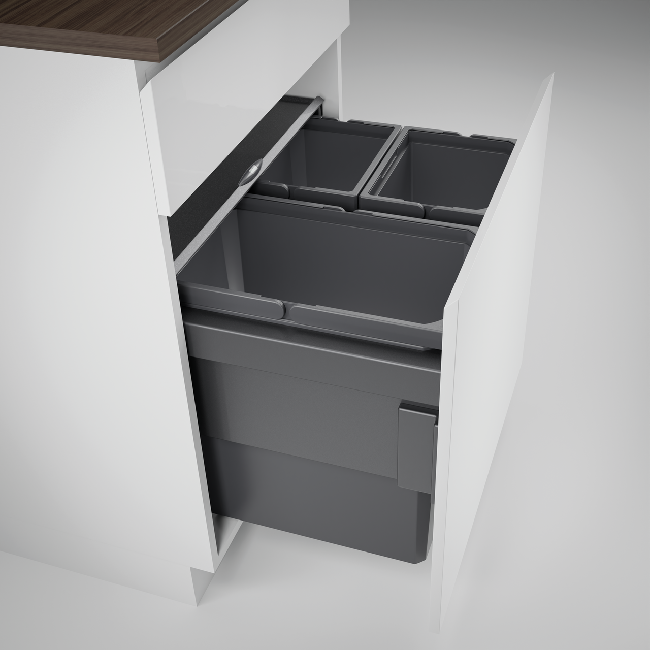 Eine einfache Trennung von Küchenabfällen ermöglicht das Mülltrennsystem Cox® Base 460 S/600-3. Durch das Frontauszugsystem lässt es sich mühelos aus- und einziehen und bietet damit einen hohen Bedienkomfort. Das Mülltrennungssystem umfasst zwei Abfalleimer mit einem Volumen von 12,5 Litern und ein Mülleimer mit einem Fassungsvermögen von 28 Litern zur individuellen Wertstofftrennung. Ein herausziehbarer Gesamtdeckel verschließt den Einbaumülleimer und bewahrt vor unangenehmen Gerüchen. Durch den praktischen Vollauszug gewährt er einen vollständigen Zugriff auf die Inneneimer. Für ein sanftes und leises Einziehen besitzt der Einbau-Abfallsammler einen Softeinzug und eine Dämpfung. Mit dem quick&easy-Montagerahmen lässt er sich passgenau und schnell an der Schrankwand befestigen. Passendes Zubehör wie die Cox Work® Utensilienbox ergänzt den Abfallsammler und bietet zusätzlichen Stauraum.