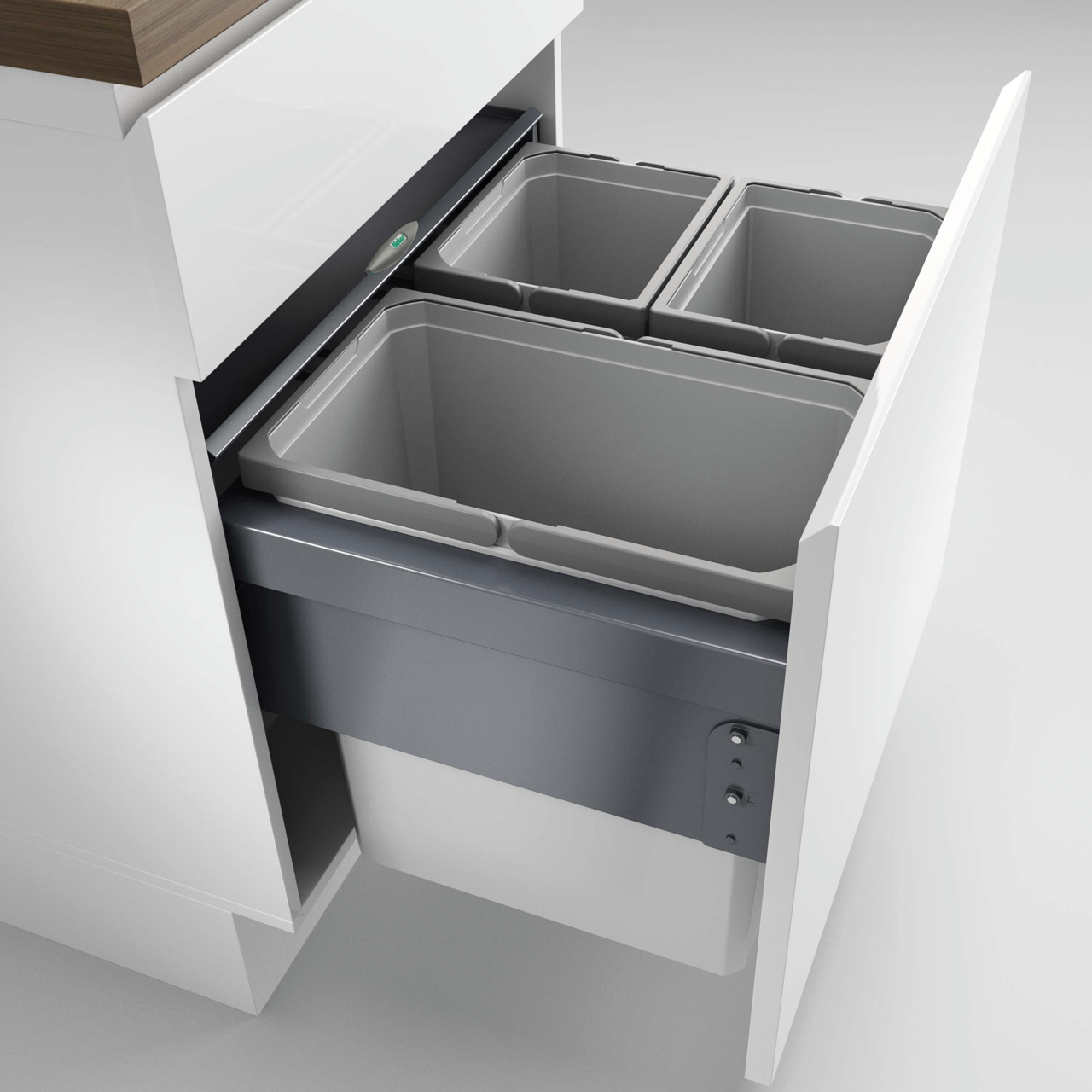 Eine einfache Trennung von Küchenabfällen ermöglicht das Mülltrennsystem Cox® Base 460 S/600-3. Durch das Frontauszugsystem lässt es sich mühelos aus- und einziehen und bietet damit einen hohen Bedienkomfort. Das Mülltrennungssystem umfasst zwei Abfalleimer mit einem Volumen von 12,5 Litern und ein Mülleimer mit einem Fassungsvermögen von 28 Litern zur individuellen Wertstofftrennung. Ein herausziehbarer Gesamtdeckel verschließt den Einbaumülleimer und bewahrt vor unangenehmen Gerüchen. Durch den praktischen Vollauszug gewährt er einen vollständigen Zugriff auf die Inneneimer. Für ein sanftes und leises Einziehen besitzt der Einbau-Abfallsammler einen Softeinzug und eine Dämpfung. Mit dem quick&easy-Montagerahmen lässt er sich passgenau und schnell an der Schrankwand befestigen. Passendes Zubehör wie die Cox Work® Utensilienbox ergänzt den Abfallsammler und bietet zusätzlichen Stauraum.