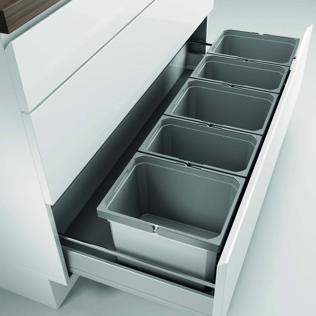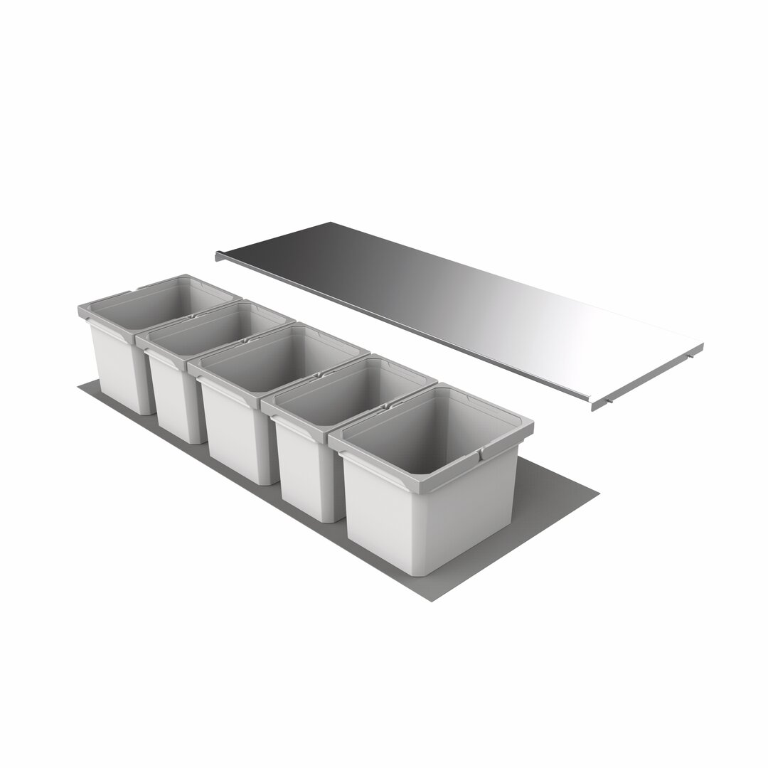 Das Mülltrennsystem Cox® Box 235 K/1200-5 unterstützt eine effiziente Nutzung besonders breiter Schränke mit Auszug. Ausgestattet mit gleich fünf Abfallbehältern und einem Gesamtvolumen von 45 Litern ermöglicht es eine sorgfältig saubere Trennung verschiedener Wertstoffe ohne zu viel Raum in der Küche einzunehmen. Die drei größeren Abfalleimer haben eine Größe von je 10 Litern und die beiden kleineren Mülleimer fassen je 7,5 Liter. Ein feststehender Gesamtdeckel aus robustem Metall sorgt für einen dichten Verschluss und minimiert dabei die Ausbreitung unangenehmer Gerüche. Für eine sichere und unkomplizierte Montage verfügt das Mülltrennungssystem über eine Antirutscheinlegematte, die ein Verrutschen der Innenbehälter verhindert.