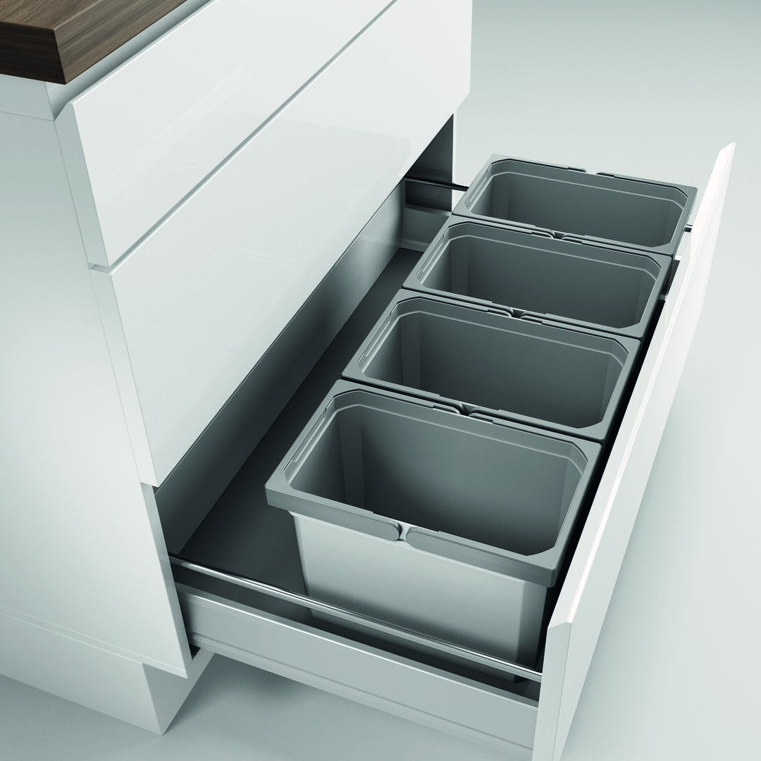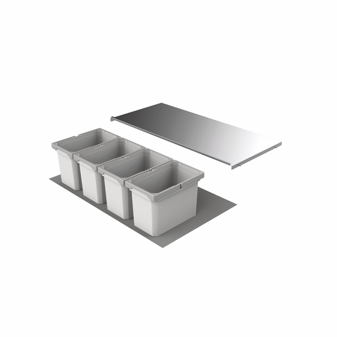 Das Mülltrennsystem Cox® Box 235 K/900-4 für vorhandene Auszüge dient zum Sammeln und Trennen von Küchenabfällen und anderen Wertstoffen. Im Set enthalten sind vier Mülleimer, die ein Abfallvolumen von je 7,5 Litern haben und individuell eingesetzt werden können. Der Gesamtdeckel aus Metall lässt sich fest und platzsparend hinter der oberen Front montieren. Neben einem dichten Verschluss der Innenbehälter schützt der Deckel auch vor unangenehmen Gerüchen. Um organische Abfälle zu entsorgen, lässt sich das Mülltrennungssystem mit einem Biodeckel bestellen. Der Einbau-Abfallsammler überzeugt durch einfachste Montage und wird gemeinsam mit der beidseitig beschichteten Antirutschmatte in die vorhandenen Auszüge gestellt.