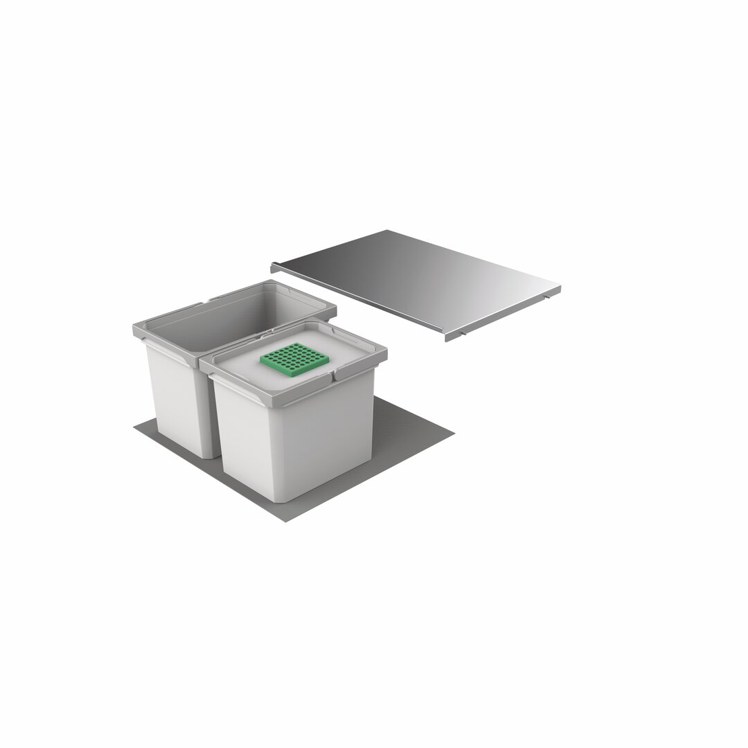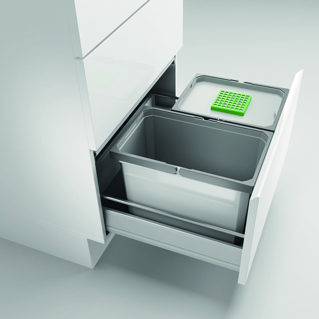 Eine clevere Lösung zur Mülltrennung in der Küche bietet der SELECTAkit Cox® Bio Abfallbehälter 275 S/600-2 für das Cox® Box-Abfallsystem. Er lässt sich auf vorhandene Auszüge hinter der Küchenfront einbauen, wodurch Abfälle versteckt gesammelt werden können. Für die Aufbewahrung und Trennung von Müll dienen zwei Abfalleimer mit einem Gesamtvolumen von 28 Litern. Der kleinere Mülleimer hat ein Fassungsvermögen von 12 Litern und der größere Behälter stellt ein Abfallvolumen von 16 Litern zur Verfügung. Um Gerüche einzuschließen, besitzt der Einbau-Abfallsammler einen Bio-Deckel sowie einen feststehenden Gesamtdeckel. Der Gesamtdeckel aus Metall lässt sich platzsparend hinter der oberen Front befestigen. Für einen kinderleichten Einbau wird das Mülltrennungssystem auf dem vorhandenen Küchenauszug montiert. Einen sicheren Stand der Innenbehälter gewährt die beidseitig beschichtete Antirutscheinlegematte.