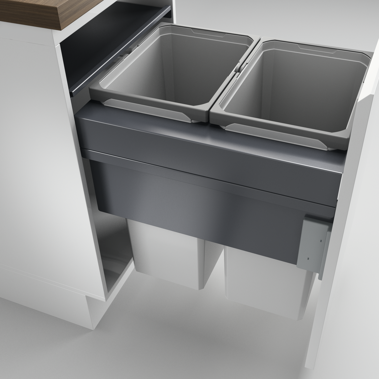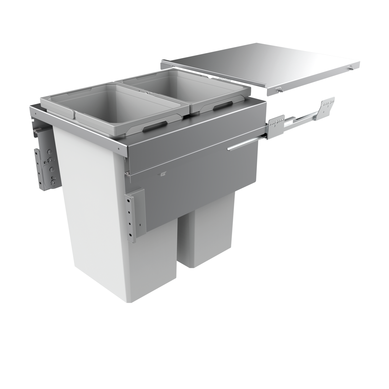 Ein stattliches Abfallvolumen und ein Überauszug sind die Highlights des hochwertigen Mülltrennsystems Cox Clan 580/500-2. Vorgesehen ist es für dem Einbau in Unterschränke mit einer Korpusbreite von 500 mm, die mit einer Frontblende ausgestattet sind. Der Abfallsammler stellt zwei hohe 35-Liter-Behälter Verfügung, die hintereinander angeordnet sind. Sie können einzeln aus dem stabilen Metallrahmen entnommen werden und lassen sich dank der Klappbügel einfach handhaben. Insgesamt kann das System bis zu 70 Liter Abfall aufnehmen. Dank der Gehäuseabdeckung aus pulverbeschichtetem Metall werden beide Mülleimer im eingeschobenen Zustand sicher verschlossen. Dabei bleibt die Abdeckung im Schrank und dient zugleich als Ablage. Im Modell integriert ist ein Überauszug, sodass sich die Mülltrennung auch bei einem großen Überstand der Arbeitsplatte voll ausziehen lässt. Softeinzug und Dämpfung sorgen für ein nahezu automatisches und leises Schließen. Zur Montage werden die Auszugsschienen an den seitlichen Schrankwänden und die Frontblende am Rahmen befestigt.
