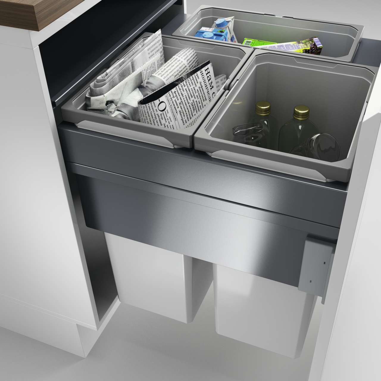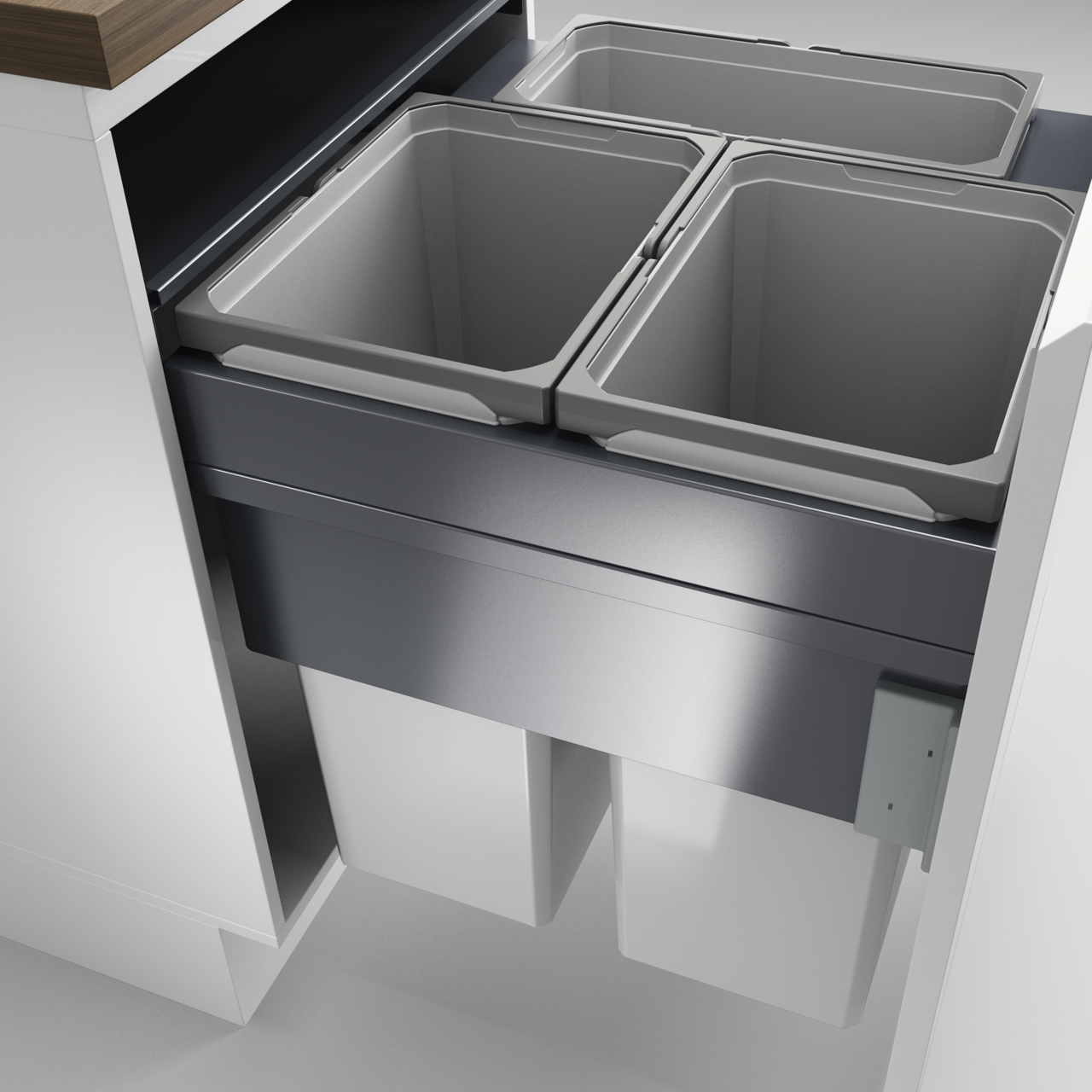 Das Mülltrennsystem Cox Clan 580/600-3 bietet sich mit einem extragroßen Abfallvolumen von 91 Litern besonders für Mehrpersonenhaushalte an. Es eignet sich speziell für 600 mm breite Küchenschränke mit einer Frontblende. Die Basis des Abfallsammlers ist ein robuster Metallrahmen, der die drei Behälter trägt. Sie lassen sich einzeln herausnehmen und bieten ein Fassungsvermögen von je 2 x 35 Litern und 1 x 21 Litern. Abgedeckt werden alle Mülleimer gemeinsam mit dem Gehäusedeckel aus pulverbeschichtetem Metall. Als Besonderheit besitzt dieses Modell einen Überauszug. Dadurch lässt es sich auch dann voll ausziehen, wenn eine Arbeitsplatte mit großem Überstand zum Einsatz kommt. Der ebenfalls in das System integrierte Softeinzug und die Dämpfung sorgen für sanftes und leises Schließen. Die Montage des Sammelsystems erfolgt an der Schrankwand und der Frontblende.