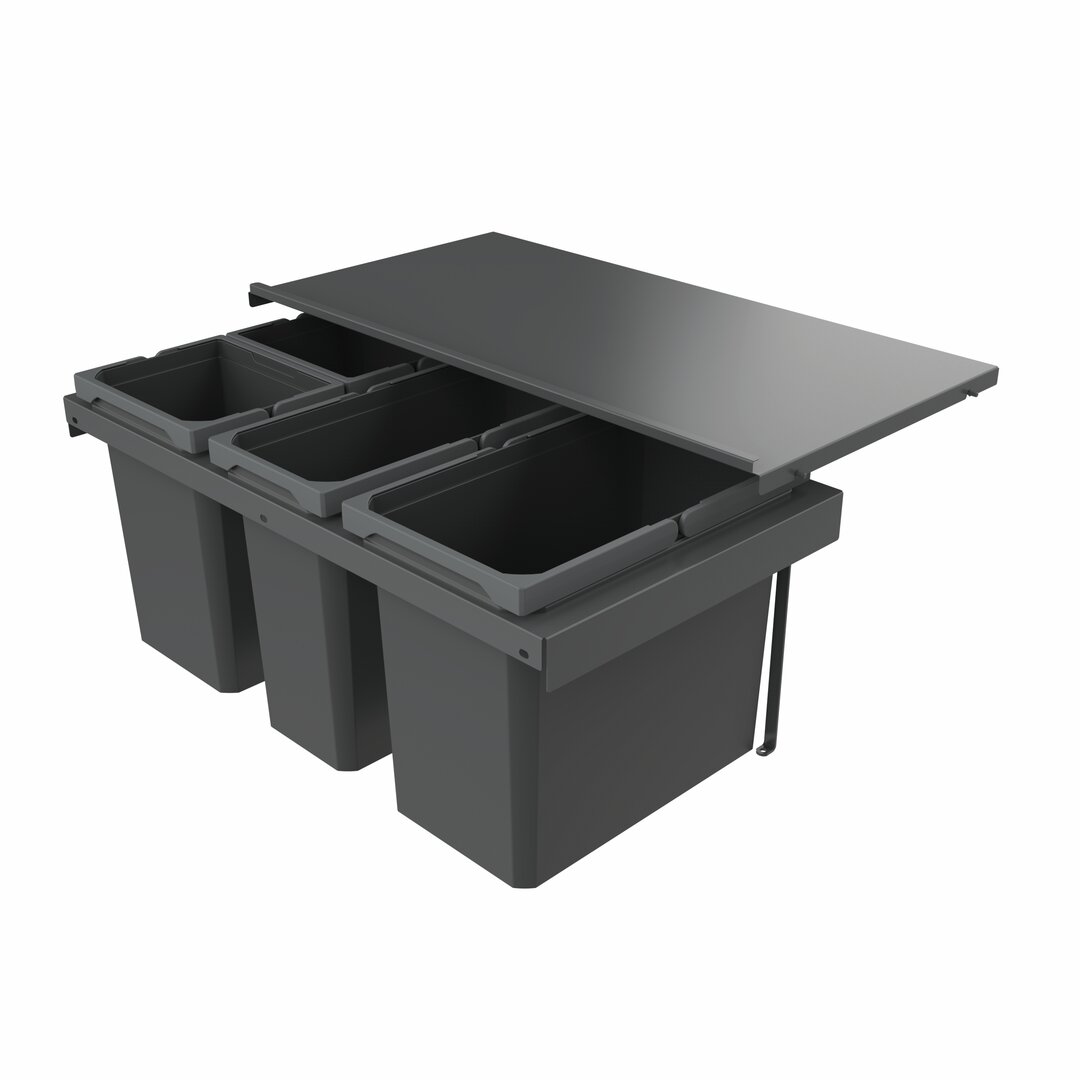 Eine ebenso komfortable wie flexible Lösung für bestehende Auszüge stellt das Mülltrennsystem Cox Stand-UP 350 S/800-4 dar. Geeignet ist es für breite Küchenschränke mit einem Standardmaß von 800 mm. Mit einem großzügigen Abfallvolumen von 58 Litern kann es für eine umweltschonende Mülltrennung sorgen, geschickt versteckt hinter dem eigenen Unterschrank. Dabei sind die vier herausnehmbaren Abfallbehälter nebeneinander angeordnet. Die beiden größeren Mülleimer fassen 16 und 22 Liter, während die kleineren jeweils 10 Liter aufnehmen können. Alle Eimer sind eckig ausgeführt und besitzen klappbare Tragebügel. Integriert sind sie in einem robusten Rahmengestell. Die Abfalleimer werden komplett über einen Gesamtdeckel verschlossen, der fest in der Schrankwand eingebaut wird. Erhältlich ist es wahlweise mit oder ohne Biodeckel. Weiteres Zubehör wie ein Biofilter, separate Verschlussdeckel oder die Cox Work Utensilienbox kann separat bestellt werden. Zur Montage wird das Gestell auf dem Boden des Auszugs befestigt.