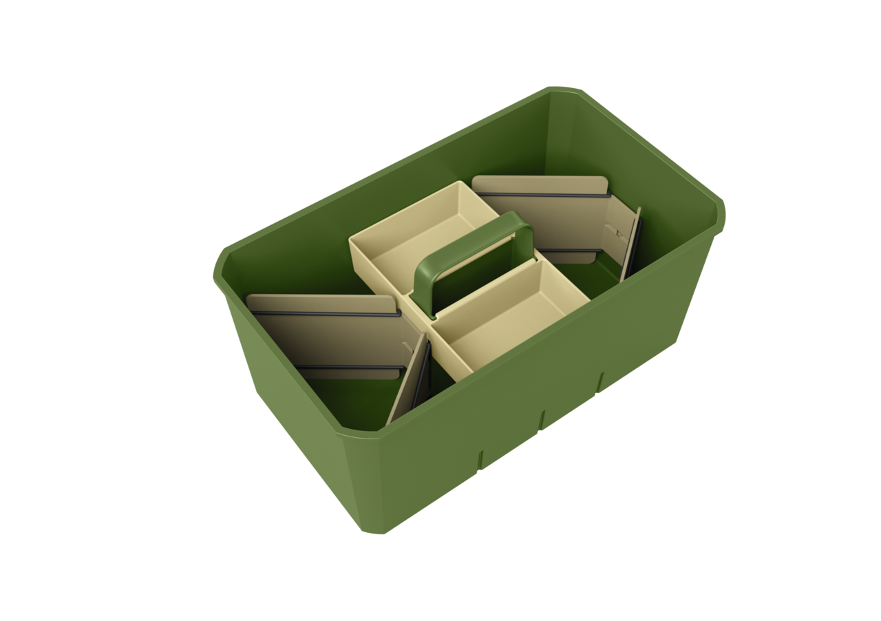 Utensilienbox. Zum Verstauen von z. B. Bürsten, Reiniger, Tabs und Tüchern.
