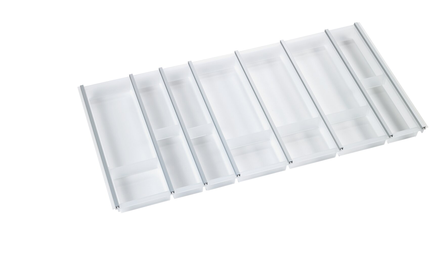 Besteckeinsatz. Für 1000 mm Schubladenbreite. Weiß-transluzent mit Aluprofil sowie graphit-transluzent mit edelstahlfarbigem Profil.