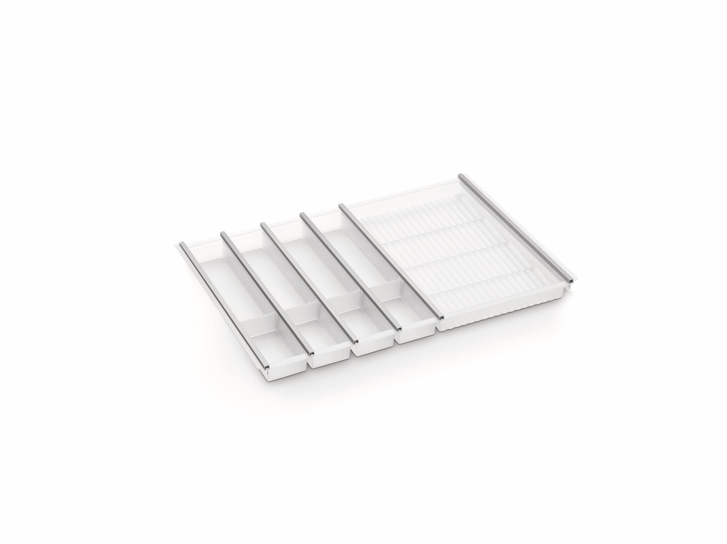 Besteckeinsatz mit Gewürzeinsatz. Für 800 mm Schubladenbreite. Weiß-transluzent mit Aluprofil sowie graphit-transluzent mit edelstahlfarbigem Profil.