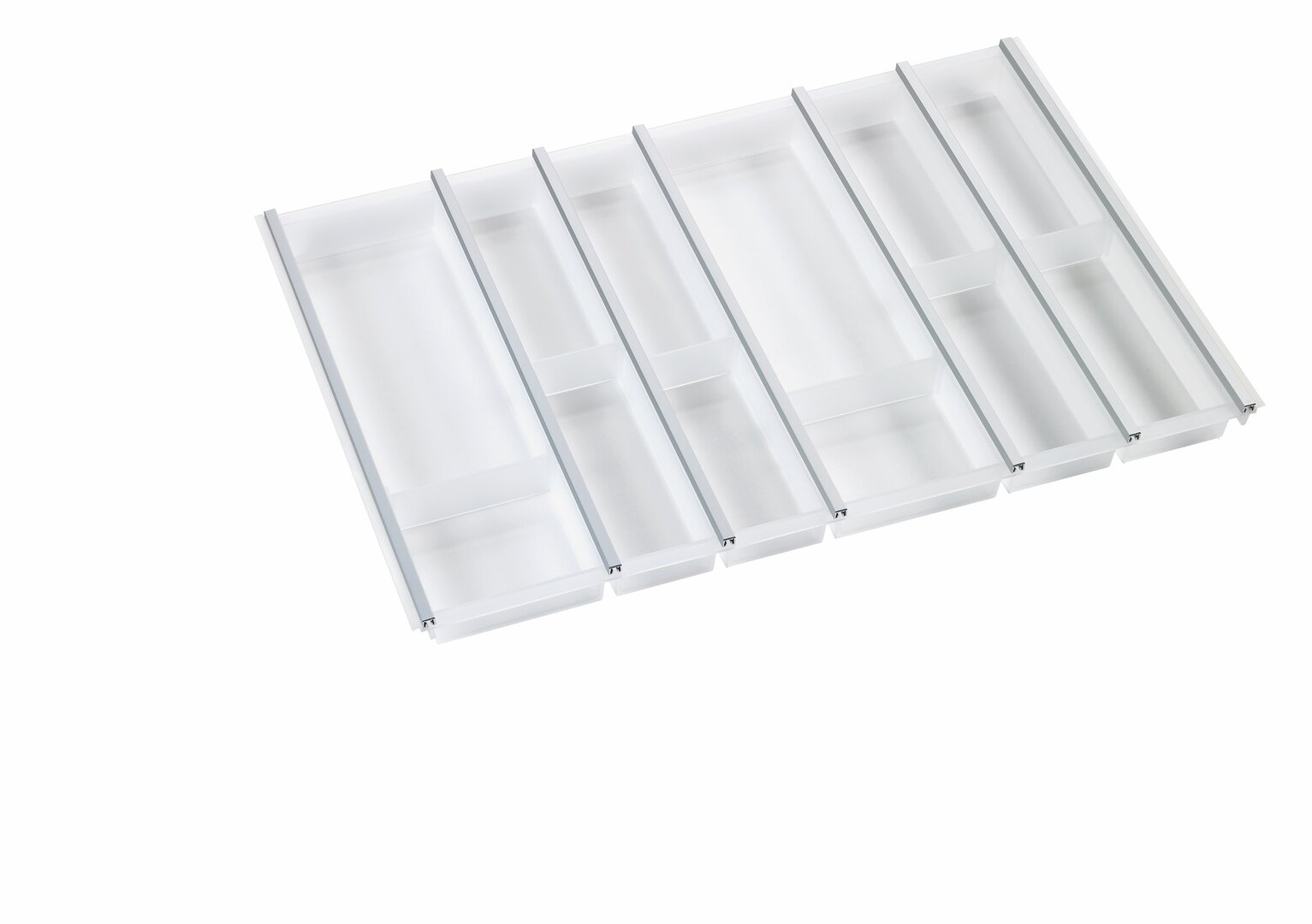 Besteckeinsatz. Für 800 mm Schubladenbreite. Weiß-transluzent mit Aluprofil sowie graphit-transluzent mit edelstahlfarbigem Profil.