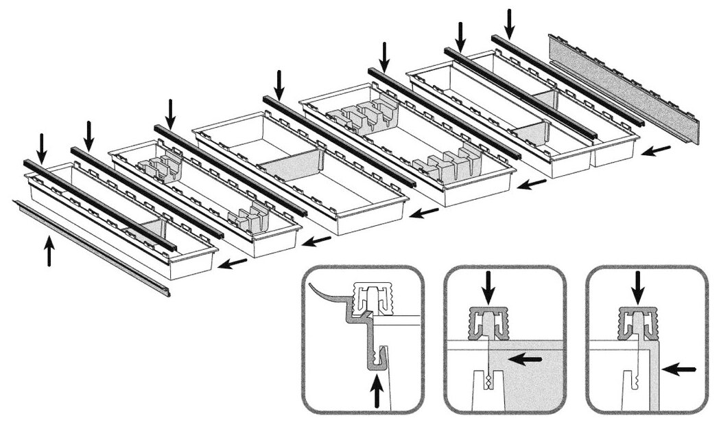 Für mehr Übersicht in der Besteckschublade sorgen die Cuisio Trennstege und Seitenabschluss 3. Sie sind original passend zu den Besteckschalen des Systems und unterteilen diese bei Bedarf. Ausgeführt sind die Schubladenteiler aus robustem Kunststoff in der Farbgebung Graphit-Translucent. Die Bestecktrenner können an beliebiger Position in die Schale eingehakt werden. Verfügbar sind sie in unterschiedlichen Breiten. Ebenso ist ein Seitenabschluss für den außen liegenden Besteckeinsatz erhältlich.