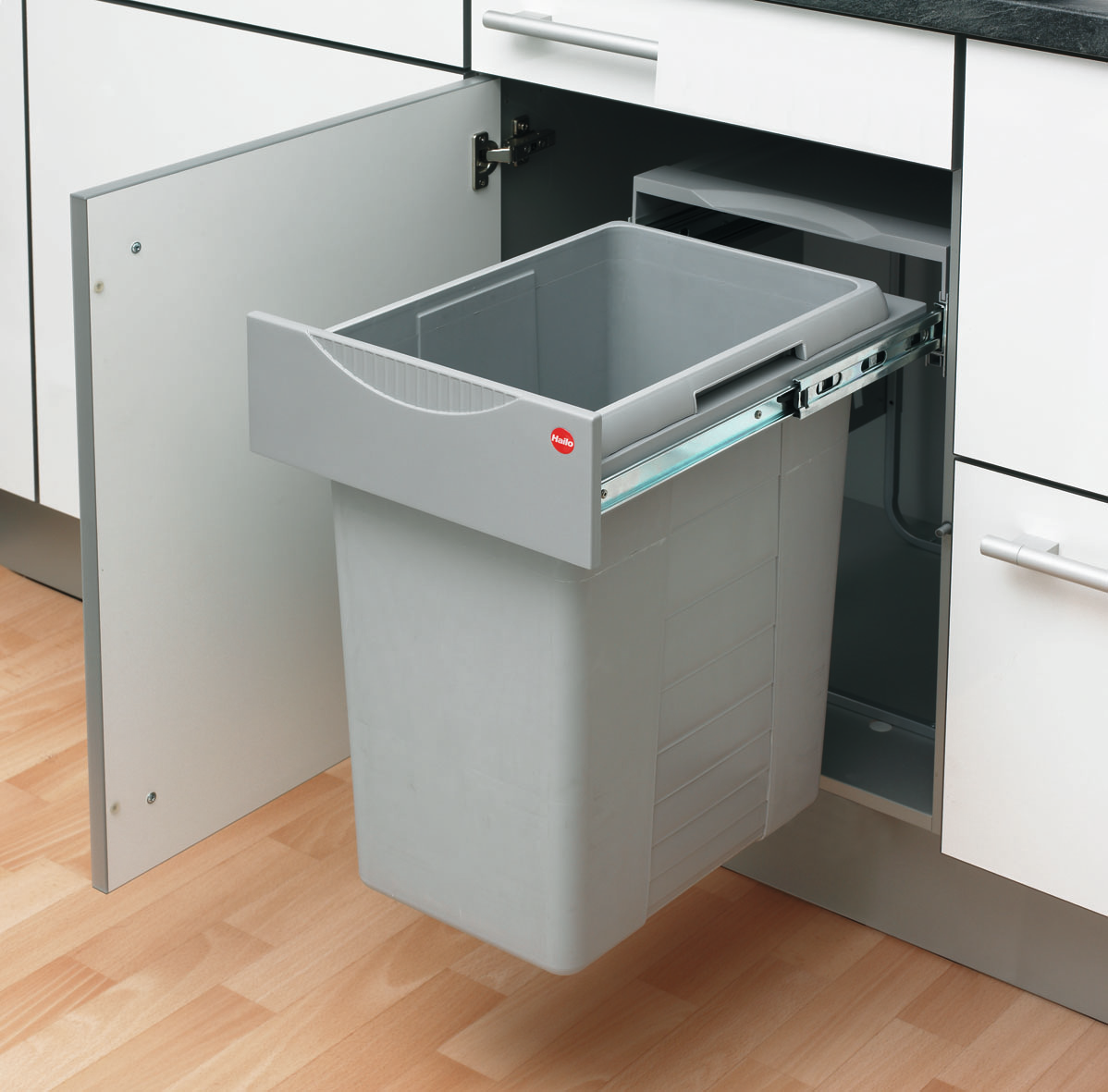 Der großzügig ausgelegte Abfallsammler Easy Cargo 1 bietet sich als Küchenhilfe insbesondere für kleinere Küchen an. Er ist speziell für Drehtüren entwickelt und passt dank geringer Maße in einteilige Unterschränke von nur 400 mm Breite. Das Modell stellt einen einzelnen herausnehmbaren Behälter mit seitlichen Griffen zur Verfügung, der ein Gesamtvolumen von 42 Litern hat. Eingeschoben wirkt die Gehäuseabdeckung als Deckel, sodass unangenehme Gerüche in der Küche vermieden werden. Über die Griffblende in der Front lässt sich das System einfach bedienen. Dabei erweist sich der Vollauszug aus Metall als komfortabel und leichtgängig. Neben der hochwertigen und langlebigen Materialausführung zeichnet sich der Einbau-Mülleimer durch seine unkomplizierte Montage aus. Die Befestigung erfolgt durch Verschraubung auf dem Schrankboden.