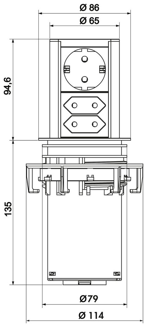 Die versenkbare CON-AKTIV® Steckdose Elevator 3 bringt Stromanschlüsse in der Küche dorthin, wo sie noch benötigt werden. Das elegante Steckdosenelement stattet Arbeitsplatten, insbesondere auf Kücheninseln, mit Strom aus. Es besitzt ein halbrundes klassisches Design mit edelstahlfarbigen, gebürsteten Blenden. Die Steckdose ist mit insgesamt drei übereinander angeordneten Steckplätzen ausgestattet, von denen einer als Schutzkontakt- und zwei als Euroflachsteckdose ausgeführt sind. Wird die 3-fach-Steckdose gerade nicht benötigt, fügt sie sich nahezu flächenbündig in die Arbeitsfläche ein. Ein leichter Druck auf den Gehäusedeckel genügt und die Einheit fährt über einen cleveren Federmechanismus heraus. Auf diese Weise bietet die Mehrfachsteckdose eine komfortable und sichere Stromzufuhr für Küchengeräte, die nicht permanent genutzt werden. Die zum Set gehörende Anschlussleitung mit dem Schuko-Stecker bietet ausreichend Spielraum bei der Installation. Der Kabelauslass befindet sich unten. Bei der Planung muss die Einbautiefe bei Auszügen und Schubladen berücksichtigt werden. Während der Steckdoseneinsatz aus schwarzem Kunststoff besteht, ist das Profil aus Aluminium gefertigt. Die Steckdosenleiste wird einfach und schnell über einen Schraubring montiert, sodass der Einbau auch nachträglich erfolgen kann.
