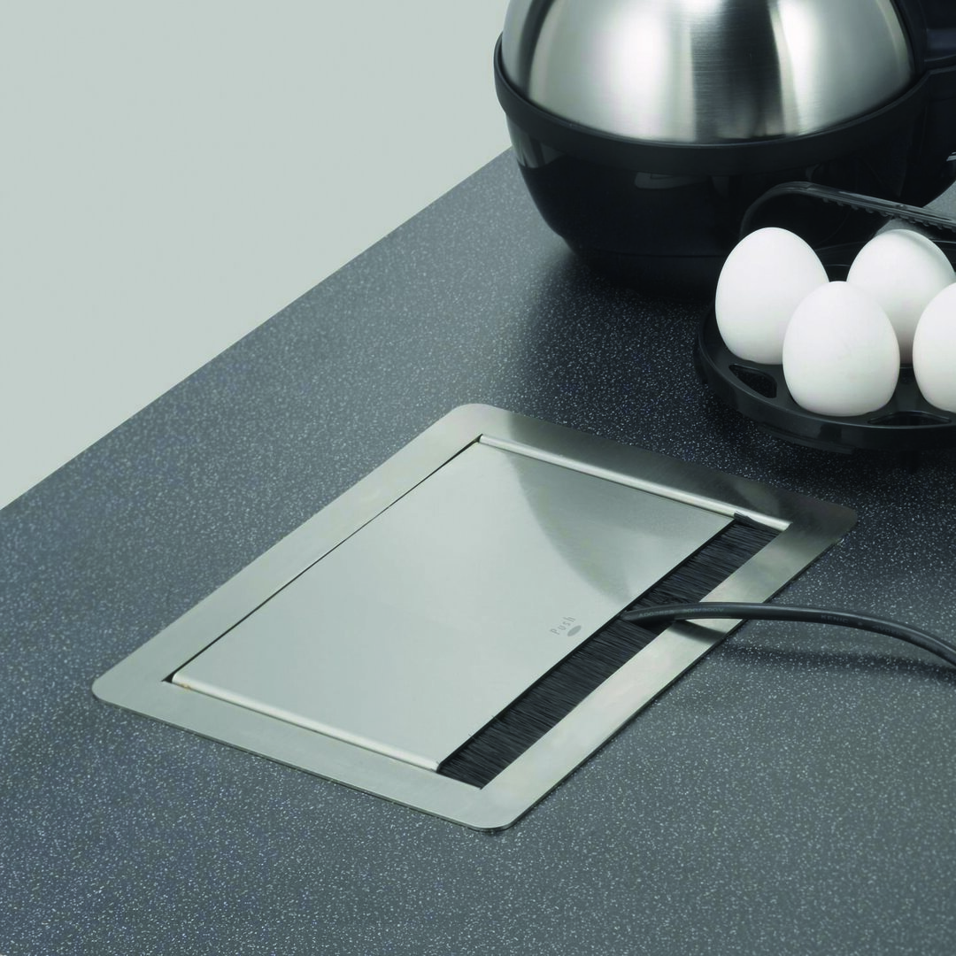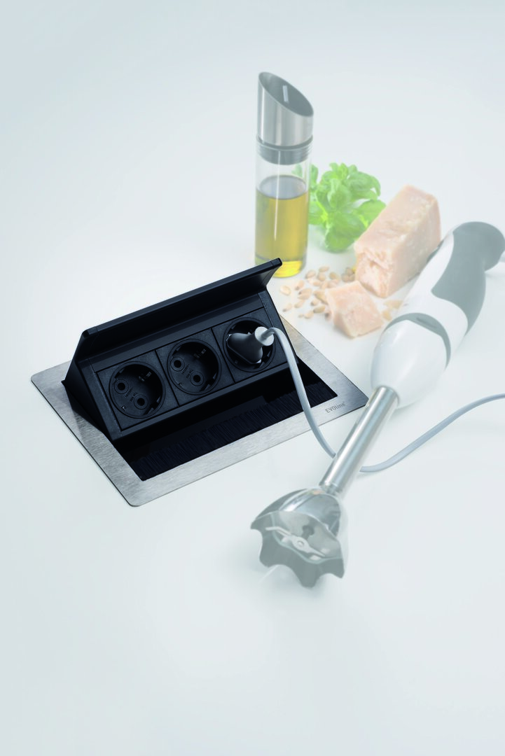 Mit der versenkbaren CON-AKTIV Evoline® FlipTop Push Einbausteckdose ist die nächste Stromquelle für den Stabmixer oder den Toaster immer in erreichbarer Nähe. Sie dient zum Einlassen in die Arbeitsplatte der Küche und ist mit drei Schutzkontakt-Steckplätzen ausgestattet. Bei Nichtgebrauch lässt sich das Element ganz einfach durch Schließen der Abdeckung einfahren. Ein leichtes Antippen des Deckels genügt, um ihn zu öffnen. Im geschlossenen Zustand fügt sich die rechteckige 3er-Steckdose flächenbündig und mit eleganter Edelstahloberfläche in die Arbeitsfläche ein. Durch den praktischen Bürsteneinsatz in der Front kann die Blende auch bei eingesteckten Kabeln geschlossen werden. Dadurch wird die Gefahr von eindringendem Spritzwasser oder anderen Verunreinigungen bei der Zubereitung von Speisen vermieden. Der Steckdoseneinsatz ist aus robustem Kunststoff in der Farbe Schwarz gefertigt. Der Kabelauslass befindet sich hinten links. Die Montage erfolgt in Arbeitsplatten mit einer Stärke von bis zu 50 mm. Dabei beträgt die gesamte Einbautiefe 68 mm. Die Fixierung erfolgt von unten. Zum Stromanschluss ist eine 3 m lange Netzanschlussleitung mit Schukostecker inklusive. Das Programm der CON-AKTIV Evoline® Steckdosen umfasst viele weitere Varianten, die sich kombinieren lassen.