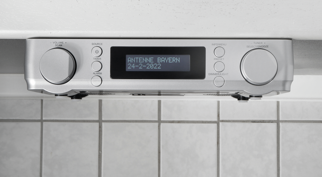 DAB+/UKW-RDS-Radio. Zum Unterbau. Mit Festsenderspeicher, dimmbare LCD-Anzeige, LED-Arbeitsplatzbeleuchtung auf der Unterseite, klappbarer Standfuß, zwei Weckzeiten, Wecken durch Radio oder Signalton, Einschlaf- und Schlummerfunktion, zwei Küchentimer, inkl. Netzadapter, Leistung im Betrieb 2 x 1 Watt RMS.